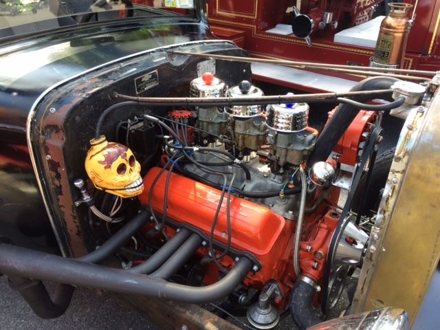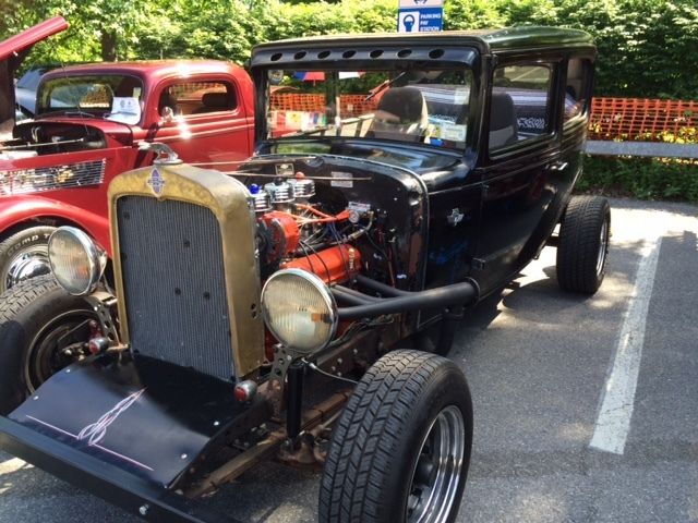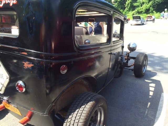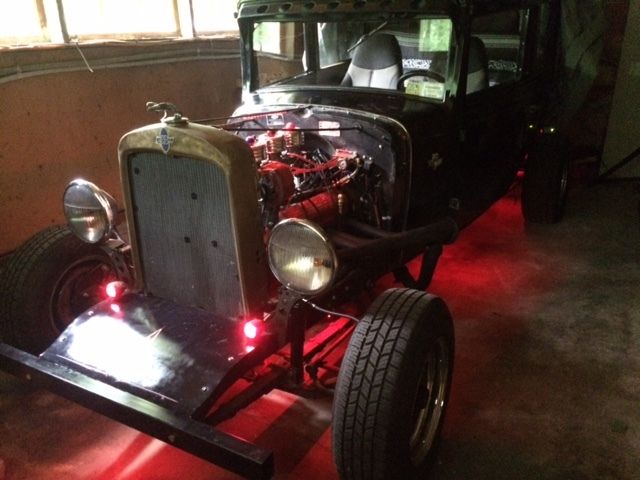 this is a very cool 1931 chevy rat rod. I wet sanded the paint to bring out the red primer and multiple coats of paint, put a 283 chevy small block V8 out of a 1956 corvette with three 2 barrelcarburetors andprogressive linkage in it, t has a TH350 automatic transmission in it the frontsuspensionis new shocks with the original leaf springs and i put coil springs in the rear.disc brakes in the front, rum in the back, hevy 10 bothrear end,I reinforced the original wood with steel so it is safer, t has lake pipes with caps and down shoot through mufflers so you can choose between loud or quiet. I installed line locks (never tested), ed neons all around the car and in the engine bay, ran a windshield wiper pump to the back tires to improve burnouts, modified the original headlights to be 12 volt, he radiator overflow is a skull tequila bottle, had custom Sumbrella covers made to cover the opening in the roof and a half cover for the engine if it rains, his car is a push button with a hidden kill switch, he gauge cluster is all digitalexceptfor the speedometer, he backseat is original with new foam and cover, he radiator shell is original with the radiator cap ornament, he windshield rolls up and down (1931 AC), strengthenedthe roof with steel and spiderwebgussets, he front seats are out of a camaro, installed a radio and 4 speakers, o powersteering, as tank is behind the rear seat, t is channeled 5 inches