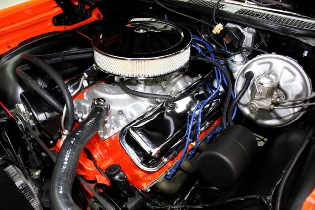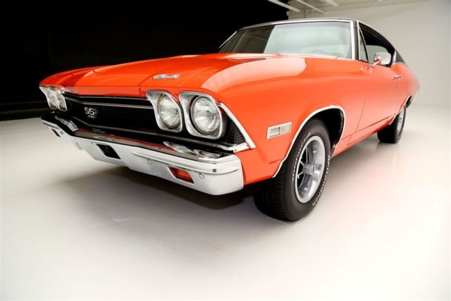 1968 CHEVROLET CHEVELLE TRUE SUPER SPORT (138) VIN, NEW HUGGER ORANGE PAINT, LOTS OF NEW CHROME, BLACK BUCKET INTERIOR, POWER BRAKES, POWER STEERING, HEAVY DUTY TURBO HYDRAMATIC 400 TRANSMISSION, F41 SUSPENSION, BOXED CONTROL ARMS AND A 12 BOLT AND A BAD ATTITUDE. Drop dead gorgeous hugger orange REAL Super Sport 138 vin car covered in show quality base coat clear coat paint and lots of new chrome all the way around, new bumpers front and back. New parking and back up lenses. All new wheel well molding, door handles, side mirrors, emblems, windshield and stainless. The metal structure of the body has very good metal integrity from the top to the very nice intact undercarriage. Under the hood has been upgraded to a fire breathing TSH code 454 big block power plant with a few more cubic inches than the 396 cubic inch motor that came with the car. The new motor is topped off with a Weiand aluminum intake and Edelbrock carburetor. This SS car comes nicely optioned with power steering and power drum brakes. The muscle car sound is pumped through a newer Flowmaster throaty exhaust. The black bucket interior is very nice with newer seat covers, carpet and door panels. New center console and new shifter. New comfort grip wheel and a very nice crack free days with a great looking instrument cluster. The undercarriage is rock solid and has all the SS goodies. F41 suspension with boxed control arms and sway bar. Heavy duty Turbo 400 Hydramatic transmission, 12 bolt rear with 307 gears for highway cruising. This gorgeous SS car is rolling on correct SS five spoke wheels and newer BF Goodrich white letter tiresPLEASE CALL FOR DETAILS 515-245-9100