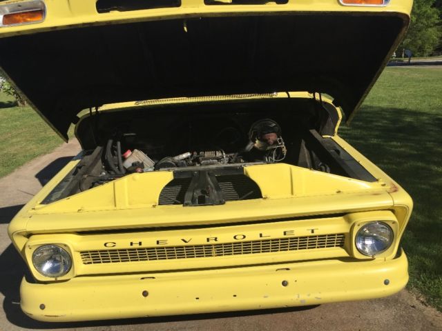 1965 Chevy C10 Stepside with a 1986 LT1 engine and 4L60E automatic transmission. Fuel tank has been removed from cab and replaced with a fuel tank designed for the truck which fits between the body rails under the bed. Fuel lines are braided and fuel filter is high performance that leads back to the EFI engine. Front drum brakes have been replaced with disc brakes with a 2 in drop spindles. Single chamber brake reserve is now duel with a power booster added. Power steering was added for better control. A new radiator and electric fans are used for cooling. The old wiring was taken out and a "painless" harness replaced all wiring in truck. Dolphin gauges are used to be the in between for the old systems to the computer of the LT1. Shorty headers were bought and a custom exhaust was installed after engine was installed. Various other parts have been installed that are not listed. Ready for someone else to take over project