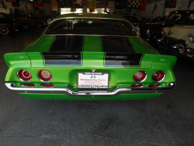 1970 Camaro split bumper, just restored, new suspension. It is powered by a bullitt proof Gear Driven 350 V8, and driven by a Muncie M21 4-Speed transmission. It is easy to drive with power steering and power disc brakes. New chrome rally wheels and new tires. It is finished in 2000 Camaro Synergy Green with Black interior. Zero rust and zero rust repair. This American Icon runs and drives GREAT, super fast, dependable, very collectable and a sound investment. Clear title and ready for the road. #516522. Now on display at the home of “over the top cars” CHECKERED FLAG CLASSICS 7743 MONTEREY ST GILROY, 408-847-8788, sold as-is, California buyers are responsible for sales tax and license fees.