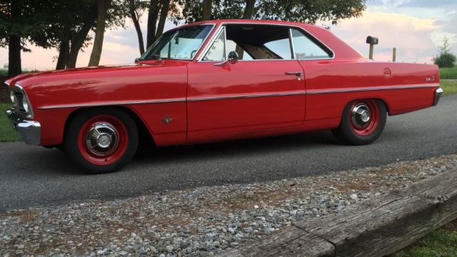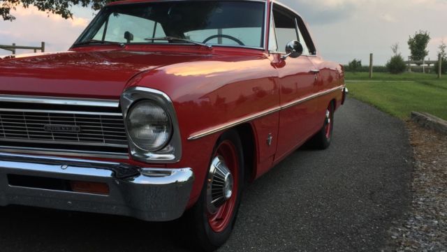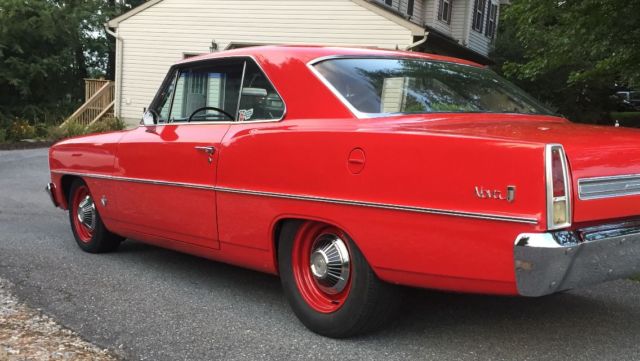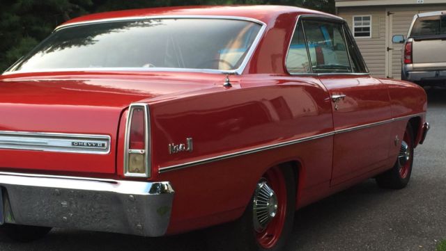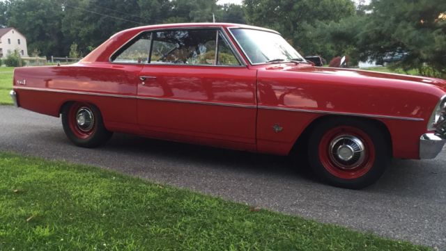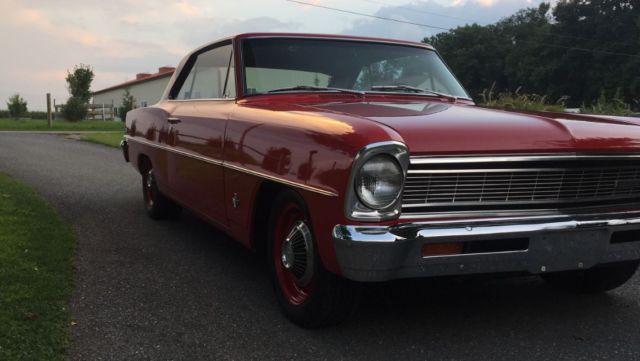 Rust free 66 Chevyll original sheet metal sports coupe. One repaint the early 90s, originally Danube blue with light blue interior. The flame red paint is lacquer. The paint has some checking and cracking all low on car not bad. Factory V8 4speed with dual exhaust. Now has 355 motor with 350 turbo trans and power disc brakes, 12 bolt rear with 373 posi.3inch exhaust and no tail pipes. Has 2inch drop spindles and lower re-arch springs. New 67ss fawn interior, headliner not installed. 15 inch steel wheels and dog caps. There are three patches in the trunk area done by previous owner. Car is not perfect but still very nice. Car needs front end alignment. Want to sell to fund another project. For sale local. Title clear and in my name.. Will answer any other question. 717-419-6397 Brent Thanks