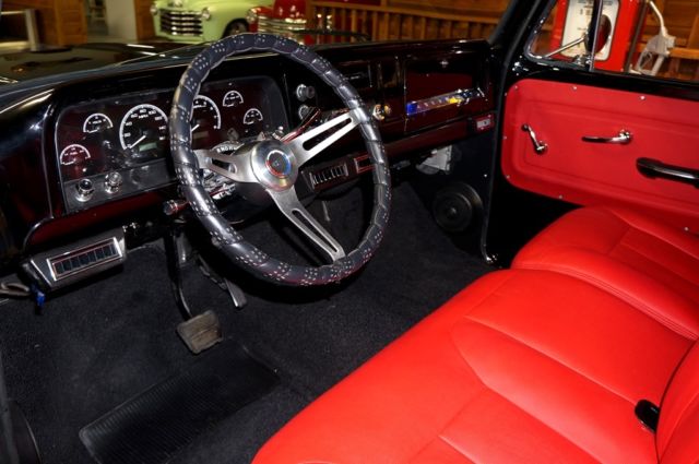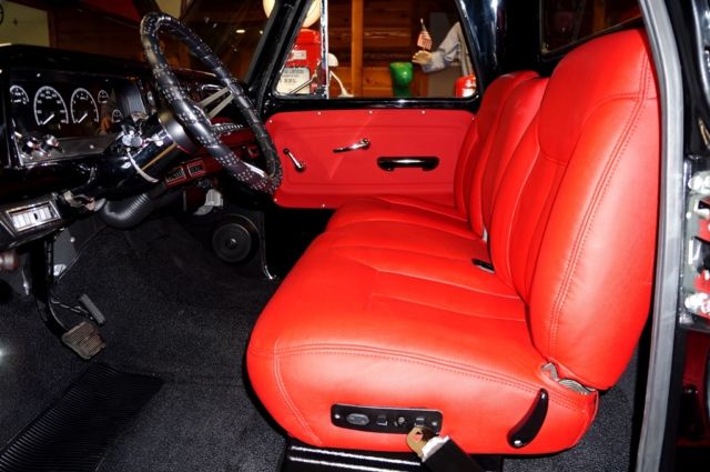 1966 Chevrolet C10 Pickup LS1 Resto-Mod LS1 fuel injected engine with Spectre air intake Automatic 4 speed OD column shift 12 bolt rear end Painted deep Black Gloss Finish New Red bench seat interior with fold down console 4 Wheels disc brakes with Wilwood Power brake booster Power steering Air conditioning Champion Aluminum radiator with electric fan Dakota Digital VHX series dash Chrome tilt column with Chevrolet steering wheel