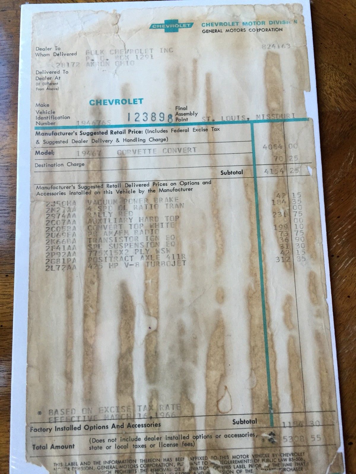 All matching numbers car with 38. 00 actual miles. This car was bought new by the original owner in Akron. Ohio and he owned the car for 47 years until his death. He left the car to his son and he kept the car for one year and I bought in 9/13 in Akron. Ohio. I am the second owner outside of the family. This car comes with much of the original doc. . such as the window sticker. manual. Protector Plate. tc. The car still has the original interior in the car and all the original equipment. Vacuum power brakes. 4 speed close ratio transmission. Auxiliary hard top. Convertible white top. PB AM/FM Radio. Transistor Ign Eqpt. Special suspension equipment. Positraction 4:11 axle. 427 ci 425 HP turbojet L72. Body was taken off of the frame and undercarriage restored by Phoenix Restoration. All numbers were checked and are correct. Paperwork. pictures and doc available of that work. Engine was rebuilt at that time as close to original spec as possible by Stinger Racing. Compression kept at factory specs of 11:1 compression. It was bored out at 15 over and dyno at 507 HP at 6600 RPM. The engine has less than 500 miles on it. Transmission and rear end was checked out and replaced with all new bearings. although not needed. Car was repainted in 1985 and has some spider web but only seen at very close range. Car shows no sign of ever being damaged.