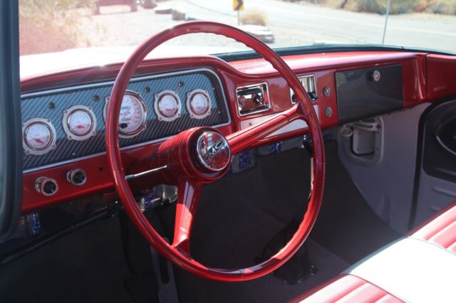 INTERIOR - Cab completely stripped and re-painted. Gas tank relocated out of cab with a new aluminum tank under the bed. Seat fully rebuilt and recovered by Hot Rod Interiors with new foam and vinyl. Custom, hand-fabricated dash with all new White faced gauges. FatMat sound and heat barrier installed before new carpet was put down. Lokar Shifter and kickdown linkage installed. New rearview mirror, visors, brackets, door handles, window cranks. Interior fresh air vents rebuilt with new seals and painted. The interior color sets off the truck perfectly and the final touch was the door panels, glove box and dash being dipped in HydroGraphics for a custom carbon fiber accent.