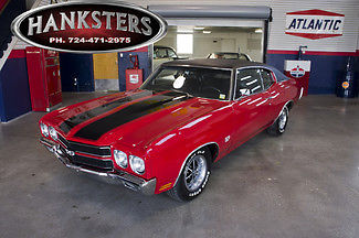 DescriptionClassic car insurance starts around $25/mo for a $25. 00 vehicle Stock # 70CHEV9993Red 1970 Chevrolet Chevelle SS396 Styled Coupe ExteriorRed exterior with Black vinyl top and Black SS stripes on the hood and deck lid2 inch steel cowl induction hoodSS grille emblem. SS396 front fender emblems and SS rear bumper emblem14 inch steel SS wheelsFutura GLS Super Sport rubber 225/70R14 on all four cornersInteriorAll Black interiorFront bucket seats with headrestsFactory dash with all new gauges that include amps. tachometer. 120 mph speedometer. clock. temperature and fuel gaugesFactory AM radioSport style steering wheelFactory four speed center console with Hurst four speed shifterSS interior badgingDrivelineNOM 396ci Big Block Chevrolet engineMuncie M21 4-speed manual transmissionGM 12-bolt limited slip rear axle and housingRPO-F41 Special Suspension. This consists of special spring and shock rates. heavier front sway bar. boxed rear lower control arms. and rear sway barFactory frame reinforcementsAdditional OptionsHEI ignitionChrome air cleaner and valve coversEdelbrock carburetor with electric chokeEdelbrock Performer ZO aluminum intakeHeaders with dual exhaust and tailpipesChrome alternatorPower steeringPower front disc and rear drum brakesDuralast batteryHeater lines are hooked up and heater works as it shouldFREE SHIPPINGHanksters offers Free Standard Shipping on every vehicle in stock to all of our customers within the U. S. Offer only applies to full retail price offers to customers within the 48 Contiguous States. Affordable Financing and Worldwide Shipping Available. For questions. please email or call. We have several classic cars in stock. please contact us directly for the most current list of inventory. Hanksters. its agents or employees shall not be held liable to anyone for any errors. omissions or inaccuracies under any circumstances. The entire risk for utilizing the information contained on this site or linked to this site rests solely with the users of this site.