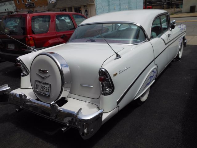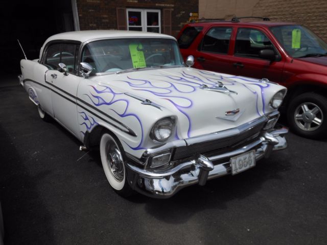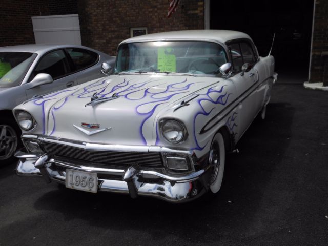 1956 custom Chevy Bel Air 4 door HT with Jasper 350 c.i. V-8 engine, Edelbrock manifold and 750 cfm 4 barrel carb, Ididit steering column, 59 Impala steering wheel, turbo 350 transmission, PS, Power disc brakes on front and power drum on rear, good tires and shocks, mustang rack and pinion steering, continental kit, purple ghost flames, 19K since redone. She is not perfect but does attract a lot of attention when she comes down the street or at local cruise ins. All panel lines do not line up perfectly. A few paint chips and the previous owner shaved the rear door handles and there are tiny cracks in this area. Price lowered to rock bottom and is firm. I recently bought a 57 Chevy and must make room.