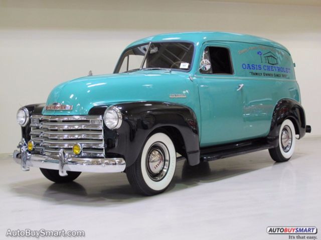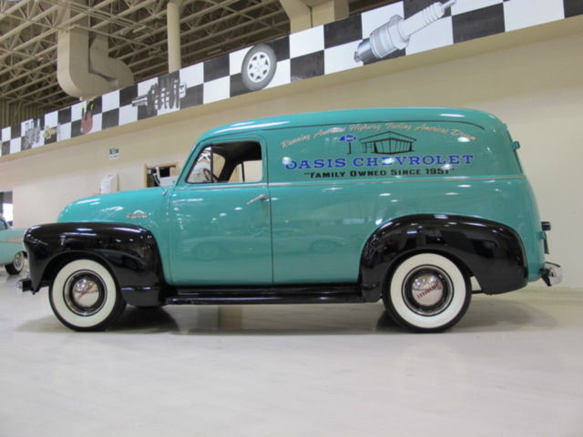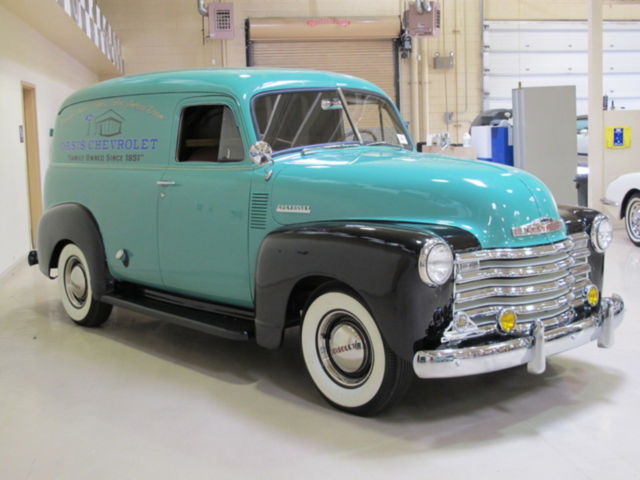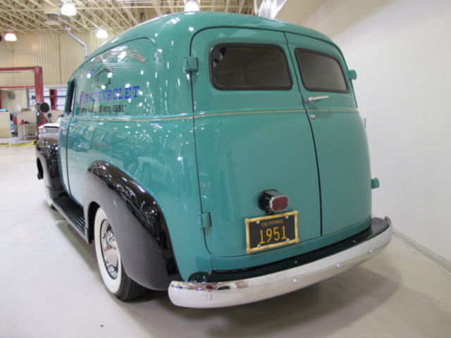 YOU ARE LOOKING AT A 1951 CHEVROLET 1/2 TON PANEL VAN. IT HAS JUST RECEIVED A TOTAL NUT AND BOLT RESTORATION. NEW WIDE WHITE TIRES, AND ALL LEATHER SEATS. ALL NEW CHROME AND GAUGES.