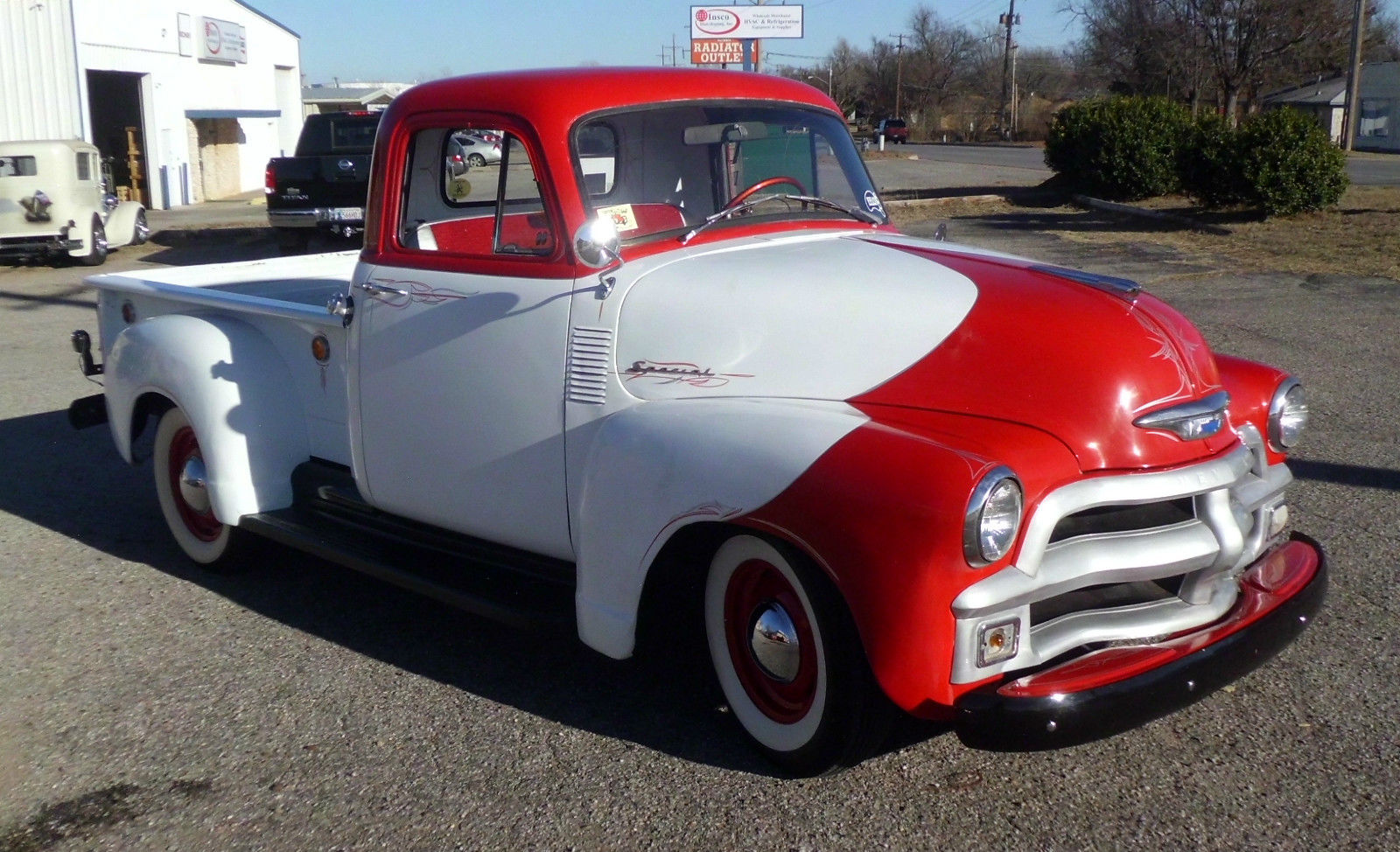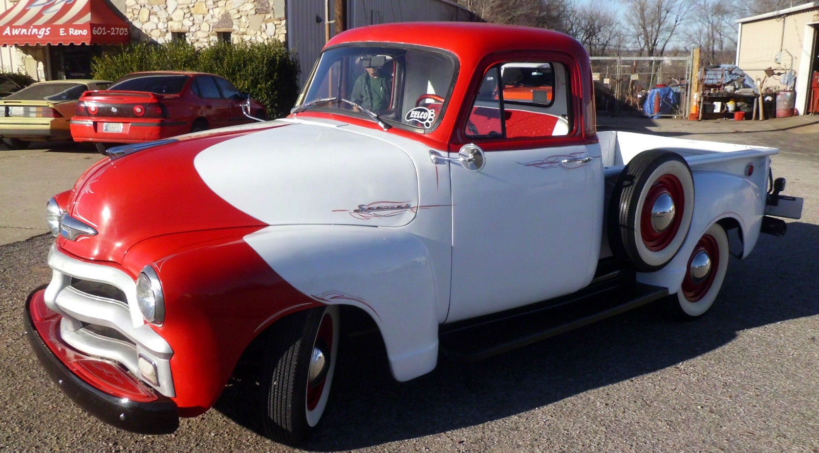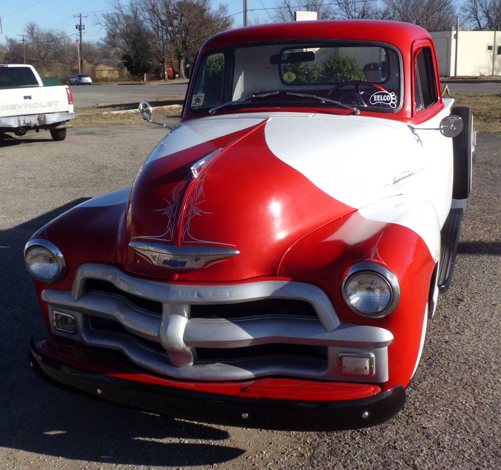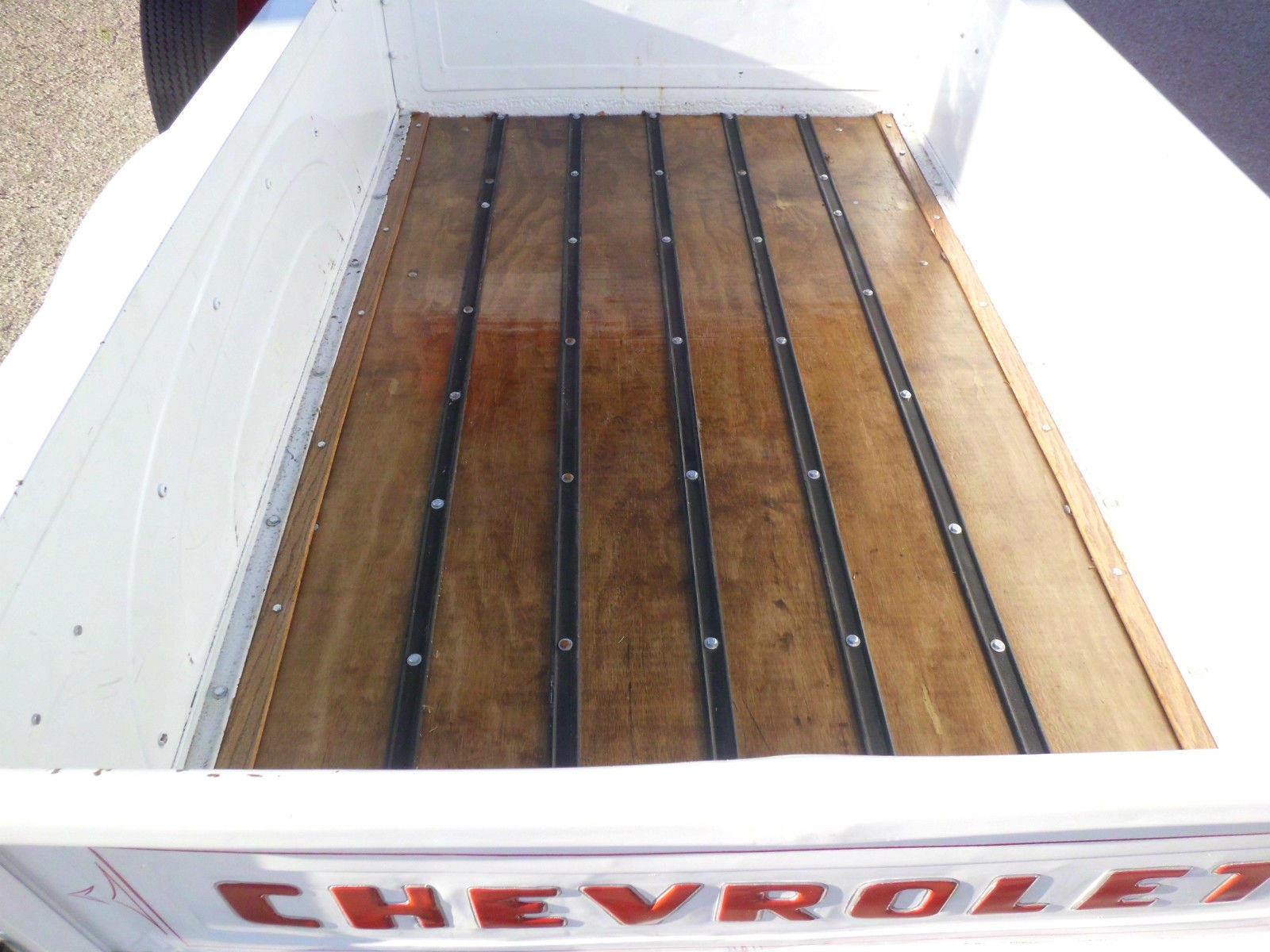 up for auction is 1954 chevrolet pickup. it has a 1966 chevrolet 230 c. i. 6 cylinder engine. this is connected to the original enclosed drive and includes a 4 speed (w/ granny gear) transmission. it has a new radiator. new brakes. new front white wall tires (coker 6/70 X 15') new allstate rear tires (6/50 X 16") and a new firestone spare. it also has a new speedway motors dropped front axle. a 1948 passenger car steering wheel. new rebuilt front seat covered in red frieze with silver trim. it has new door seal gaskets. a new bed constructed from a single piece of plywood with original runners. new 1948 chevy pickup tail lights. new turn signal switch. a new set of baldy/moon hubcaps. the floor and cab corners show no apparent rust and the floor pan has been coated with (por-15).