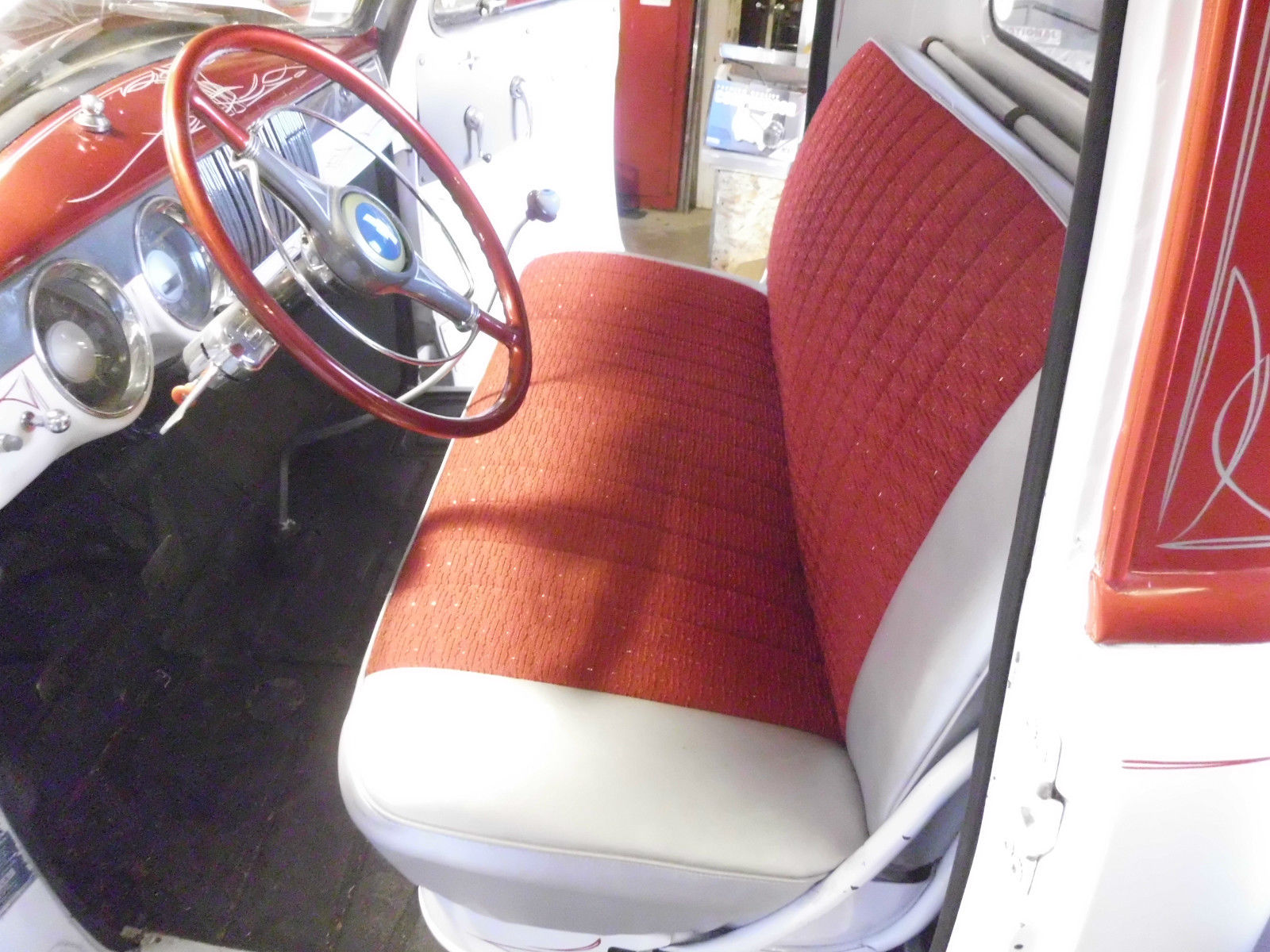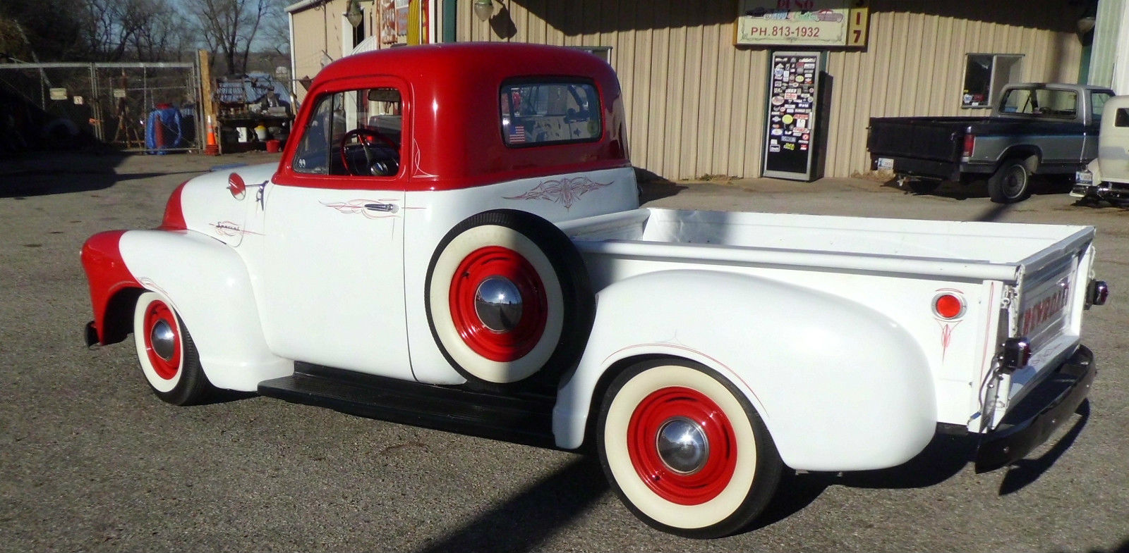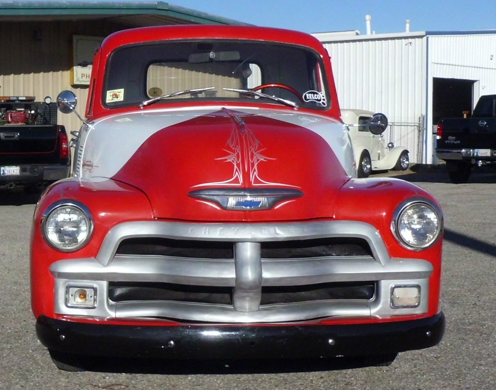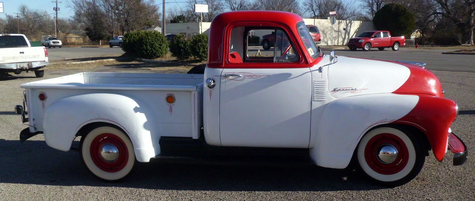 up for auction is 1954 chevrolet pickup. it has a 1966 chevrolet 230 c. i. 6 cylinder engine. this is connected to the original enclosed drive and includes a 4 speed (w/ granny gear) transmission. it has a new radiator. new brakes. new front white wall tires (coker 6/70 X 15') new allstate rear tires (6/50 X 16") and a new firestone spare. it also has a new speedway motors dropped front axle. a 1948 passenger car steering wheel. new rebuilt front seat covered in red frieze with silver trim. it has new door seal gaskets. a new bed constructed from a single piece of plywood with original runners. new 1948 chevy pickup tail lights. new turn signal switch. a new set of baldy/moon hubcaps. the floor and cab corners show no apparent rust and the floor pan has been coated with (por-15).