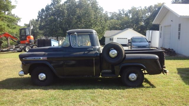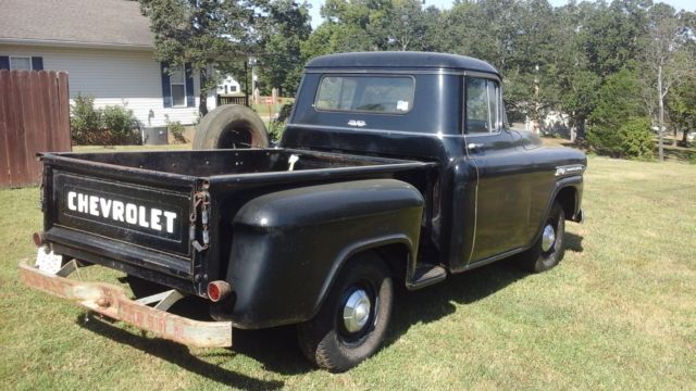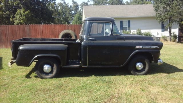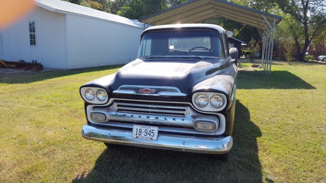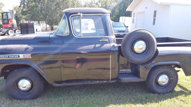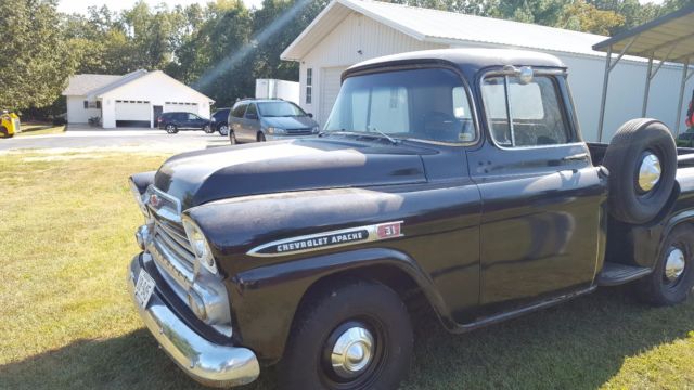 Clear Missouri title in hand. Only 19,410 ORIGINAL MILES. This is an all original and everything there 1959 Chevy Apache 31. It has the original 235 inline 6 cylinder with 3 speed on the column. It has some surface rust on the bumper and a few other areas but no rust holes anywhere. (see pictures and look carefully) It was purchased new by our uncle and used briefly in his painting business. It was then passed to his son, our cousin, and he only drove it on weekends or special occasions. The battery died and it was not started for the last 15 years. It was recently acquired by the current owner, who is the cousin, and after points, plugs, brakes, oil and filer, used tires, a quick carb cleaning, and the addition of a quick add on gas tank, was started up and runs and drives. The motor runs well with a good smooth sound. It will shift, drive, and stop with no problems. The add on gas tank was due to the suspicion the factory tank may have contamination, but it is there and should be cleanable/repairable. All the gages work with the exception of the gas gage, but that may be repairable when the tank is cleaned. Someone has put a chrome mirror up high on the drivers door, but the black factory mirror is included and can be re-installed. The door seals are not in very good shape and will need replaced as you would expect for a truck that is 58 years old. The wooden bed has a big hole and needs replacement as you can see in the pictures. Although it runs after a quick carb cleaning the carb will need a proper rebuild as it leaks with the engine running like the float is set incorrectly. There was also a little antifreeze leaking out of the radiator cap as it ran, but the engine came up to a normal temperature and showed no signs of running hot. Underneath everything looks stock with no modifications. The exhaust system is factory and doesn't leak. After starting the engine it did smoke but that is probably due to the carb needing rebuilt. After running a few minutes it stopped smoking. The interior is all factory and looks pretty good with no rips or tears. All the controls feel tight with very little play as it shifts and functions smoothly. This is truly a very rare find with all parts there as it was when new, and with incredibly low milage. The possibilities for this truck are limitless. It could be fully restored, left as is, or modified any way the new owner would like. Contact me though ebay with any questions or if you would like to arrange a look in person. This is truly a one of a kind 1959 Apache considering all factory parts are there, and the super low milage. Add it to your collection, and thank you for looking.WINNING BIDDER TO MAKE CONTACT WITHIN 24 HOURS.