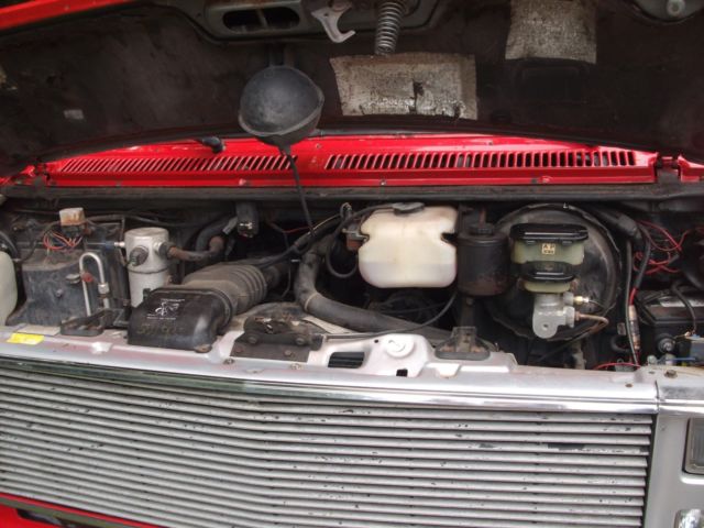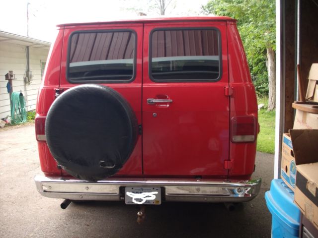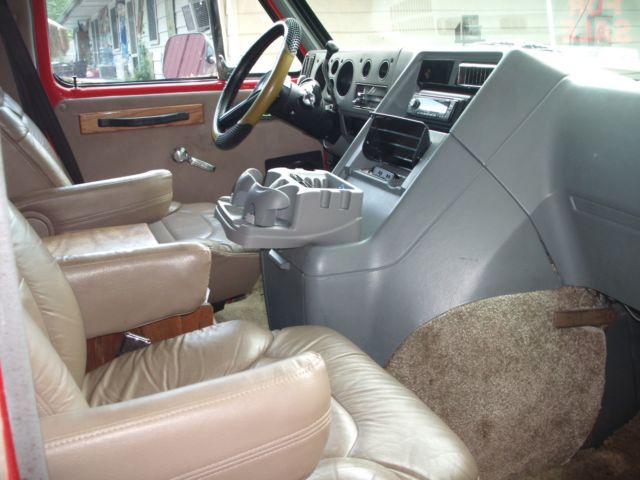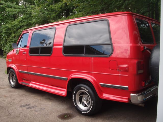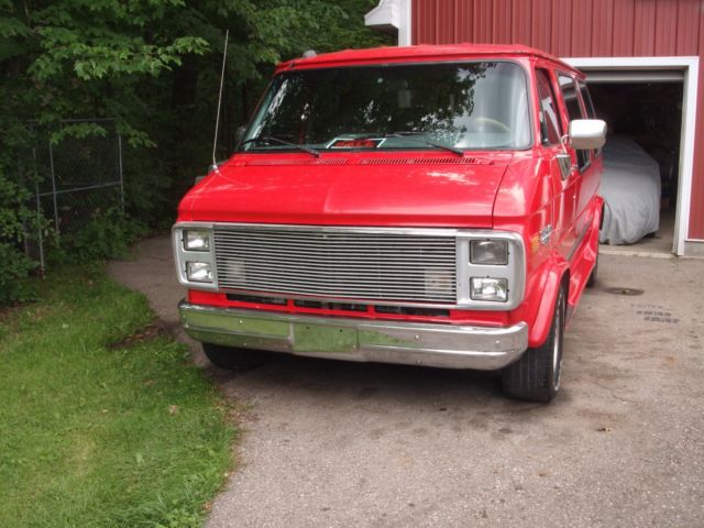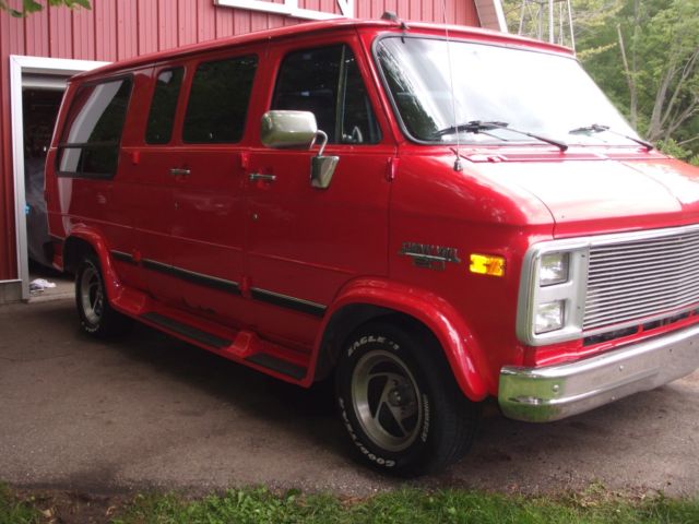 1988 CUSTOM CHEVY VAN-THIS IS A CUSTOM CHERRY RED CHEVY VAN HAS A -350/AUTO V-8-WITH OVERDRIVE-HAS A 1993 DRIVETRAIN,MOTOR,TRANSMISSION,AND REAR END,RUNS AND DRIVES GREAT,GOOD BRAKES,DUAL EXHAUS, 120,000 MILES,CUSTOM GRILL,CUSTOM INSIDE INTERIOR,LIGHT EFFECTS ALONG THE CEILING,TOP SIDES,AND SOME ALONG THE BASE.DONE IN CUSTOM WOOD GRAIN IN AREAS,COMES WITH A SIRIUS RADIO,WILL NEED TO BE HOOKED UP OR PROGRAMMED AGAIN FOR SIRIUS RADIO,LEATHER SEATS,FOLDABLE POWERED BACK BED OR RECLINES BACK UP FOR SOFA SEATING,,HAS A TV,VCR TAPE INSIDE TV.TINTED WINDOWS,SHADES ON EACH WINDOW INSIDE,ALARM SYSTEM,SIDE STEPS,RUNNING BOARDS,COMES WITH BACK HITCH,DOES SHOW RUST ALONG THE BOTTOM WAS RESTORED AT ONE TIME COULD USE RESTORATION AGAIN.,SPLIT ALONG THE BACK RUNNING BOARD PLEASE NOTE IN CIRCLED PICTURES,RUST HOLE ALONG THE RUNNING BOARD AREA,,, BUBBLING COMING THROUGH ALONG THE BOTTOM,TIRES ARE GOOD,BUT STARTING TO SHOW WEAR,DOES HAVE AIR WILL NEED TO BE RECONDITIONED,....AWESOME VAN A LOT OF FUN FOR TRAVELING,CAN SLEEP AT LEAST 4 PEOPLE,I TRAVELED IN MANY TIMES,AND TRULY ENJOYED IT,NO HURRY TO SELL THIS...I HAVE OWNED FOR 11 YEARS,WOULD BE A GREAT COLLECTIBLE,WILL NEED RESTORATION, TO MAKE PERFECT AGAIN,OR COULD & DRIVE THE WAY IT IS.THANKS FOR LOOKING!! ////810-639-2206~~~~~ NO SHIPPING PICKUP ONLY~~~~