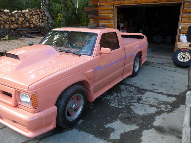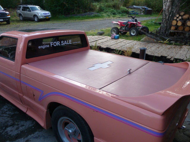 This is an awesome custom S-10 has placed 1st in car shows. It was constructed in Reno Area in 1990s. Our son bought it about 4 years ago in Alaska. You can view it on You Tube at phatalaskan. com The Pink Beast. it has been chopped 3 inches . owered. shaved. Solenoid door openings. Tuck and roll interior and sides of pickup beds. Diamond plate tonneau bed cover with vinyl cover with Chevy Bowtie emblem. the mill is a 406CI Tunnel Ram . Dual quad Holleys. Edelbrock manifold. Stainless headers. utomatic. Factory Air. ower brakes. ower windows. power locks. electric doors . any billet accessories. ustom wheels. round effects. olded in tail gate. This looks to have been a frame off build I replaced the dual point accel distrubutor and coil with a solid state HEI distributor igintion system and new Champion spark plugs and new ignition harness. All removed parts go with the truck. We trailered it down this past fall from Alaska for easier access for a buyer.