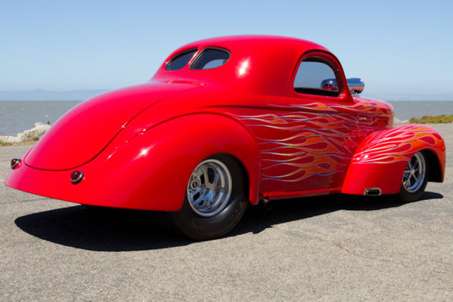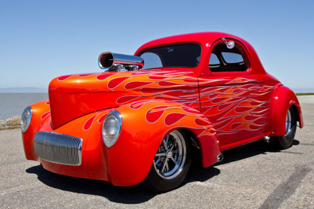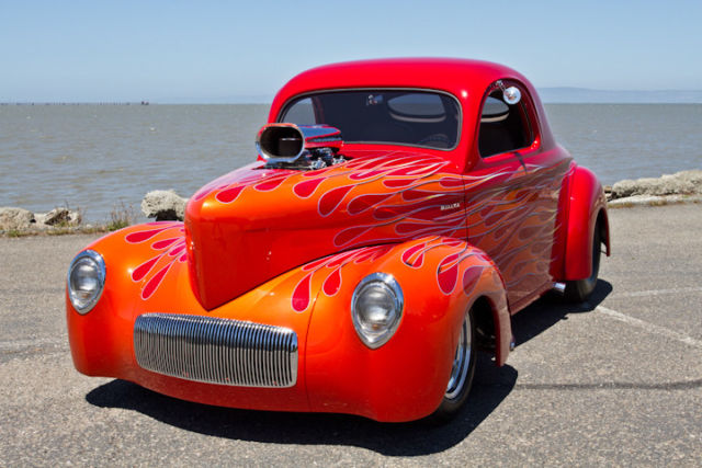 This is a very rare offering if you're looking for one of the cleanest Quality built pro street 41 Willys, this is it! This Willys has been meticulously maintained. It was built between 2000 -2004. The frame and body have been built by Outlaw chassis. Under the hood, it is powered by a 468 BBC. A 871 BDS blower sits on top of it with two new Holly carburetors. The custom build headers are by Dominator Street Rods, it has a 3 inch exhaust with 3 inch Mooney's electric cutouts. The turbo 400 transmission has recently been serviced and inspected. With a B&M shifters that are excellent. The outlaw Chassis has been beautifully powder coated. It is equipped with Heidt's Superide Independent front suspension and 4 bar rear suspension with coilovers on all four corners. It is equipped with four wheel disc brakes, front are Wilwood and rear are Aerospace calipers and Alden polished aluminum shocks. Rear tires are Mickey Thompson's 15 x 15 w/ 33 x 21.5, fronts are Mickey Thompson's 15 x 5. And a, extremely cool looking Currie 9 inch polished aluminum housing. It has 350 gears with 15 gallon fuel cell... all stainless steel hoses and stainless steel fasteners. The finish is extremely tasteful. It is painted a Poppy Red with outstanding flame work done by Mild to Wild. With very cool Ghost Eagles in the flames. The interior is tastefully done Design installed by Portage trim shop with altered Dodge Viper seats. I-Did-it Polished Aluminum tilt column w/ Billet Specialties leather wrap wheel and Autometer Gauges. Electric window door poppers remote works all of it.