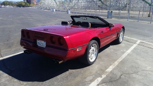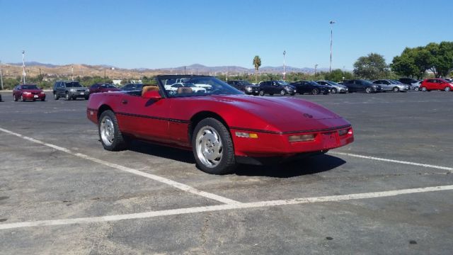 This auction is for a 1989 Corvette Convertible auto. This car runs great and has been thoroughly gone through. Mechanically, she is perfect. Original Brilliant Red or Burgundy color. Freshly painted using PPG primer, PPG color and PPG clear. Passed CA smog with no problems. A/C works. She has an Alpine DVD Navigation stereo with streaming bluetooth. New oil pan, valve cover and transmission gaskets. Absolutely no leaks. Also rebuilt steering pump and rack/pinion. New tie rods and alignment. She steers like new. New master brake booster, master cylinder, calipers, brake hoses and pads. Brake fluid is fresh. New fuel pressure regulator, icm, cap, rotor, spark plugs and wires. All factory spark plug clips have been replaced so the wires are routed properly. Dash works perfectly. Dash lights were replaced with xenon so they are bright and won't burn out the display. Headlights work perfectly.Her interior is decent for a driver, but is what is left to restore her. The carpet is nice, except for the ledge where the door opens. This part is separate from the main carpet and may be able to replace just the ledge. Passenger seat is nice. The power driver side looks ok, but has rips on the lumbar support. The door panels look ok, but should be replaced. They are cracked inside. The power locks click, but aren't moving the locks. The horn does not work.Everything else on this car, including the A/C works. Power windows, electric antenna, interior lights, gauges, side mirrors, etc. all work. The bluetooth automatically connects to your Phone and continues playing once you have connected it. No need to pull out your phone and press play. Also has a Kenwood mini sub with built in amp under front passenger seat. Helps even out the sound with the top down.Overall this is a great running and looking car that needs minimal interior work to be perfect.Body: New paint, no chips, no cracks, no dings. Excellent paint.Mechanical: Great condition, starts right up, idles smooth, does not overheat, shifts smooth, very strong and good acceleration. Many new parts. All maintenance items up to date.Suspension: New rack/pinion, rebuilt steering pump, new tie rods and alignment. BF Goodrich 285/40/17 rear, 255/45/17 fronts. The tread looks good, but the tires are old. She still drives smooth, but I would recommend replacing them.Top: Black convertible top is in decent shape. No rips, but there is a mark on the driver side where the frame folds. Plastic rear window is not yellow. Not super clear, but not too bad. Original color was tan according to codes.Interior: Drivers seat has small rips on lumbar support. Passenger seat is in nice condition. Headrests had a cover going across both of them to deflect wind. This left black smudges. There was a dash kit previously installed so all panels have extra screw holes. Main panel trimmed to fit Alpine double din stereo. Dashpad is cracked. Black carpet cover looks nice. New sunvisors. Door panels look nice, still shut tight, but have cracks internally. Probably the reason for the door locks not working. Steering wheel is worn. Could be the reason for the horn not working. I would replace.Weather stripping: New outter window sweeps. The rest of the weather stripping looks ok, but is old and brittle. I would recommend replacing all of it.