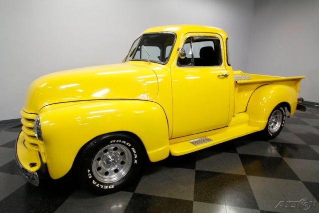 Advanced Design Chevy trucks seem to be one of the hottest vintage pickups going because they combine an upright tough appearance with some of the sleek lines that make other GM products iconic in the '50s. So we're always excited to have a 1953 Chevrolet 3100 5-window truck like this one that perfectly blends old style with new amenities â€" like the A/C interior. The two-piece windshield, big rounded fenders, and sought-after five-window cab are all great classic elements. But the bright yellow paint also signals this is more than a just a vintage machine. It has been nicely customized in areas like the painted grille and de-chromed hood that purposely give this one a more modern appearance. It's not to say that this one doesn't have nice bright work, but without out a shiny overload, you get to appreciate the elements like wraparound bumpers and racing style wheels much more. Plus, the full diamond plate bed with matching tool box is the coolest way to upgrade the shine on this truck while still reminding us all it's tough enough for weekend chores. Inside is some vintage charm with plenty of nice upgrades. The exterior yellow returns on the door tops and dash, and now it's joined by a deep black for plenty of distinction. Nicely-bolstered bucket seats, carpeting, and an AM/FM/CD stereo w/aux input are all huge upgrades over what was available in '53. You even have modern R134a air conditioning blowing nice and cold. Plus, with the Camaro-style NK4 steering wheel, large speedo & tach, and full auxiliary gauge package, this is very much a driver's machine. Open the hood to see what we all want â€" a stout 350 Chevy small block. It's instantly apparent money was recently invested here with such tidy belts, wires, and hoses. More than just look good, it has all the right go-fast goodies like an Edelbrock four-barrel carburetor, Edelbrock Performer intake, and double-hump heads. The long tube headers add even more power as they also contribute to the rumbling dual exhaust. Plus, with a three-speed automatic transmission, power steering, and front disc brakes, it's easy to bring all this power to the streets. Here's that ideal pickup that nicely blends old and new style into one custom build. And you get to enjoy it all from A/C comfort. So don't let this deal slip away, call today!