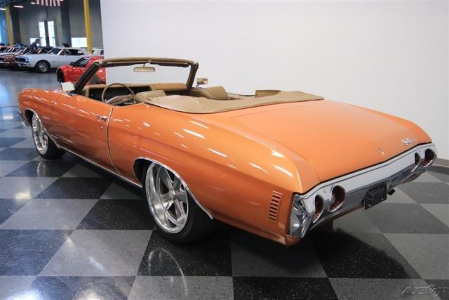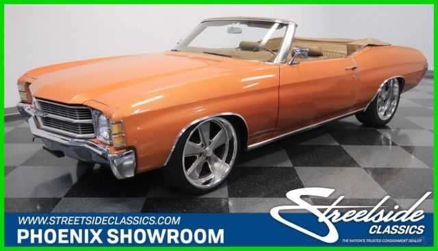 You're looking at the rare opportunity to own a standout classic. There were less than 5,100 Chevrolet Chevelle Malibu convertibles produced in 1971, and very few convertibles ever came after this. So you get iconic lines, rarity, and even the right upgrades in this classic V8 droptop. Code 62 Burnt Orange is the car's original color, but when the sunlight hits this convertible, you instantly can tell it has the extra luster of a respray later in life. It's great to see someone invest in quality, because we all love it when a sunshine-friendly droptop looks great in the sunshine. This one did not get the SS treatment added over the decades, and instead wears its premium Malibu personality with pride. In fact, the white convertible top adds to this classic's distinction. And it's this upper-class personality that lets you enjoy the straight sheetmetal with gentle curves, well-defined creases, and flowing front hood. A car this solid also retains all the right brightwork pieces â€" from the form-fitting bumpers to the delicate wheel arch trim. And the large 20-inch US Mags alloys add to this cruiser's individuality. The distinction continues inside with the correct saddle tan interior. This is a great coordinating hue with the exterior orange, and so this is a terrific total package inside and out. You can tell there have been some nice investments in newer components, including the seat covers. So you have two rows that will comfortably hold plenty of family and friends. But a convertible like this is really about the driver. That's why you get the factory dual-spoke steering wheel that gives you a commanding view of the old-school speedometer that's about as long as the horizon. And while the power folding roof helps to button the whole car up quickly, there's also an alarm system, so you can quickly secure the vehicle even if you're just popping into the shops. When you lift the hood, the dark and tidy presentation funnels your attention to the bold orange block and shiny air topper. The 350 cubic-inch V8 looks great in the engine bay with the presentation, and topped with a four-barrel carburetor. So you get a nice extra hit of power and a sweet sound out of the newer dual exhaust. Out on the road, the power steering, three-speed automatic transmission, and modern grip of ZR-rated performance tires all come together to give you an easy, anytime cruising feeling. Complete with owner's manual and a copy of the original buildsheet, this is a rare and interesting convertible that is also a strong cruising machine. It's a terrific total package, so don't miss you chance at it. Call today!!!