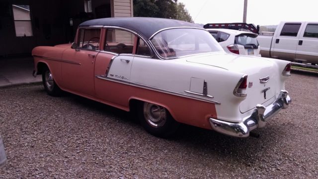 This is a pretty original car with only a couple owners and 1 long term owner. The car is showing 21900 miles and so does title as actual miles. I was told by the person that I got it from that he got it from a old fellow that had it for 40 years and told him that it is original miles, From what I see I think it could be correct. The firewall still has the white chalk marks that was put on by factory. The car runs great. There has been several things done recently to make sure it is road worthy including new gas tank, New fuel sending unit, New fuel pump, Carb cleaned and new parts inside, New brakes and wheel cylinders. Head lights & dash lights interior lights glove box light signals horn wipers heater gauges and old 8 track player works. The car has bias tires which are old so for long trip I would change them. There is some paint flaking and the car has been touched up in different places but looks nice and original. The roof is faded. The rubber mat in the trunk was falling apart so I removed it, You can buy a new one online for about $125.00. This is just a nice car to enjoy and drive. The automatic transmission and motor sound and work very good and the car does not run hot. Some time ago the upper back was painted white. The original color was the coral that is on it with the grey roof. The under carriage is original and is in good original condition not painted. This is a neat old 55 that is pretty original and has great pantina. The car is being sold in AS IS CONDITION.. NO WARRANTY. You are welcome and encouraged to come and take a look before making a offer. Any questions please contact me at 740-260-2282 Thanks. Buyer must take care of shipping.