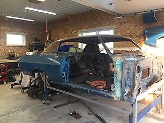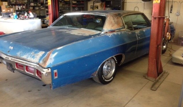 Original 1969 Impala S/S Hardtop Project Car for Sale. One of twenty-four hundred made this year. True all original classic sleeper. Disassembled. Original Protect-O-Plate. Original Complete 427-390 H.P. (T1118LI1J171374), 400 transmission, 12 bolt posi, Front Disc Brakes, Bench seat, Rally rims, Factory dash tach, etc. Body mounted on transportable dolly. Frame has been sandblasted and epoxy primered. New floors installed. Many extra parts including two front clips, additional 12 bolt non posi, new trunk sheet metal to be installed, two front and rear bumpers, Fastback trunk lid and rear glass, additional aluminum radiator, etc. Car was running before disassembly. Everything is there. Needs restored.