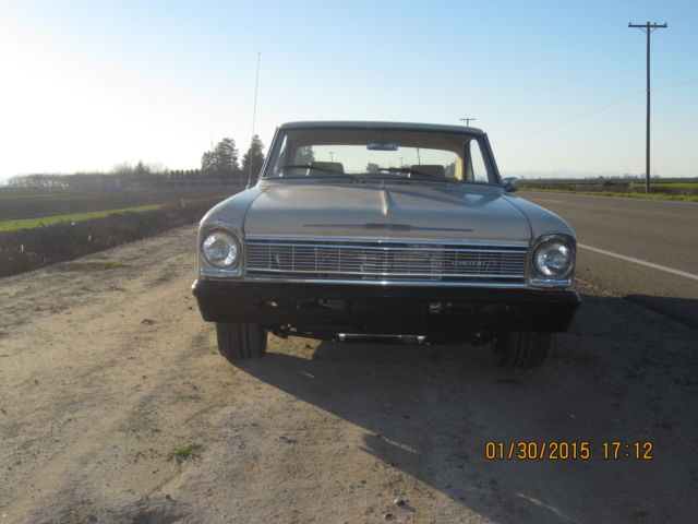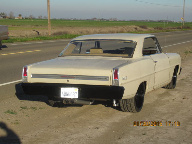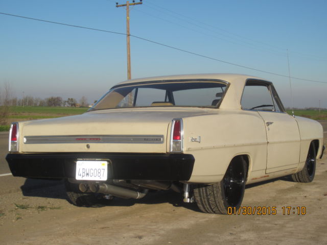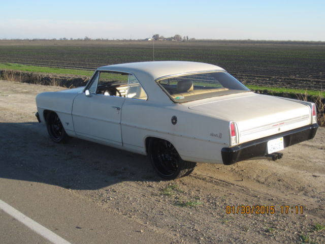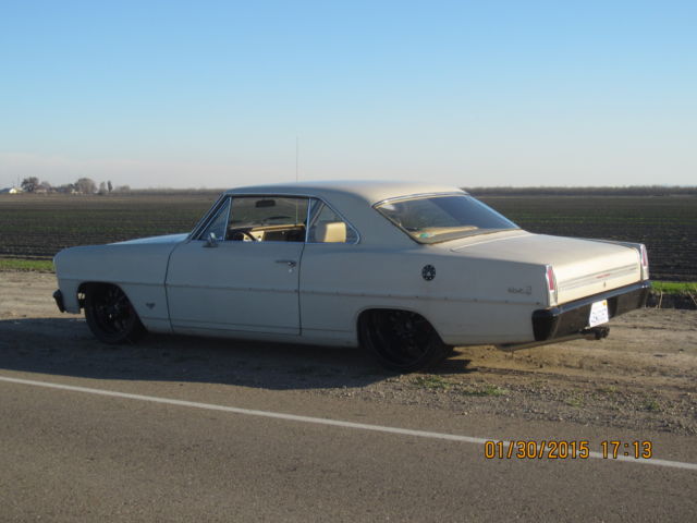 1966 Chevy Nova 2door hardtop Second owner! To start with it has a LS3 motor 6 speed automatic transmission. The chassis has a Chris Alston’s front clip (7700-3) with shock waves not coil overs. Wilwood front brake package 13” rotors with 4 piston calipers. Manual steering rack; Wilwood brake master cylinder with adjustable proportioning valve. The rear suspension is Chris Alston’s G-bar pro-touring kit (5814-x10) with rear shock wave single adjustable varishock. Narrowed Ford 9” rearend with full posi and 4. 11 gears with disc brakes. Air ride technologies ride pro block valve. 5 gallon tank and 2 Viair compressors all put together nicely in the trunk. Inside it has an Ididit steering column with a billet steering wheel. The gauges are nothing else but Dakota Digital VHX series full sweep silver face with the blue lights. Tan interior keep the stock feel but with new front bucket seats from Scat (Procar). back seat was re-upholstered to match the front seats. new carpet and headliner to match. All windows and doors work properly. It has 18x8 and 20x11 Budnik wheels powdercoated black with Nitto Invo tires. Bumpers are new and powdercoated black. Ride tech black billet gas door and new gas tank from Tanks Inc. Full exhaust system 2 1/2” all the way back from manifolds back. x-pipe with single chamber flowmasters and stainless steel flowmaster tips. sounds badass! The body and paint is stock. there isn’t any rust or body rot on the car. All panels and fenders are all still original. Missing the center chrome on both sides. Car runs and drives great. fast and reliable while getting great gas mileage.