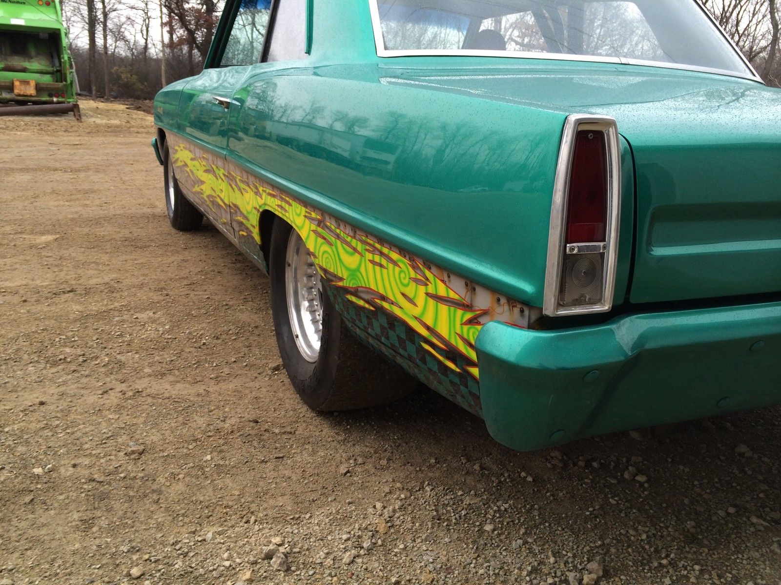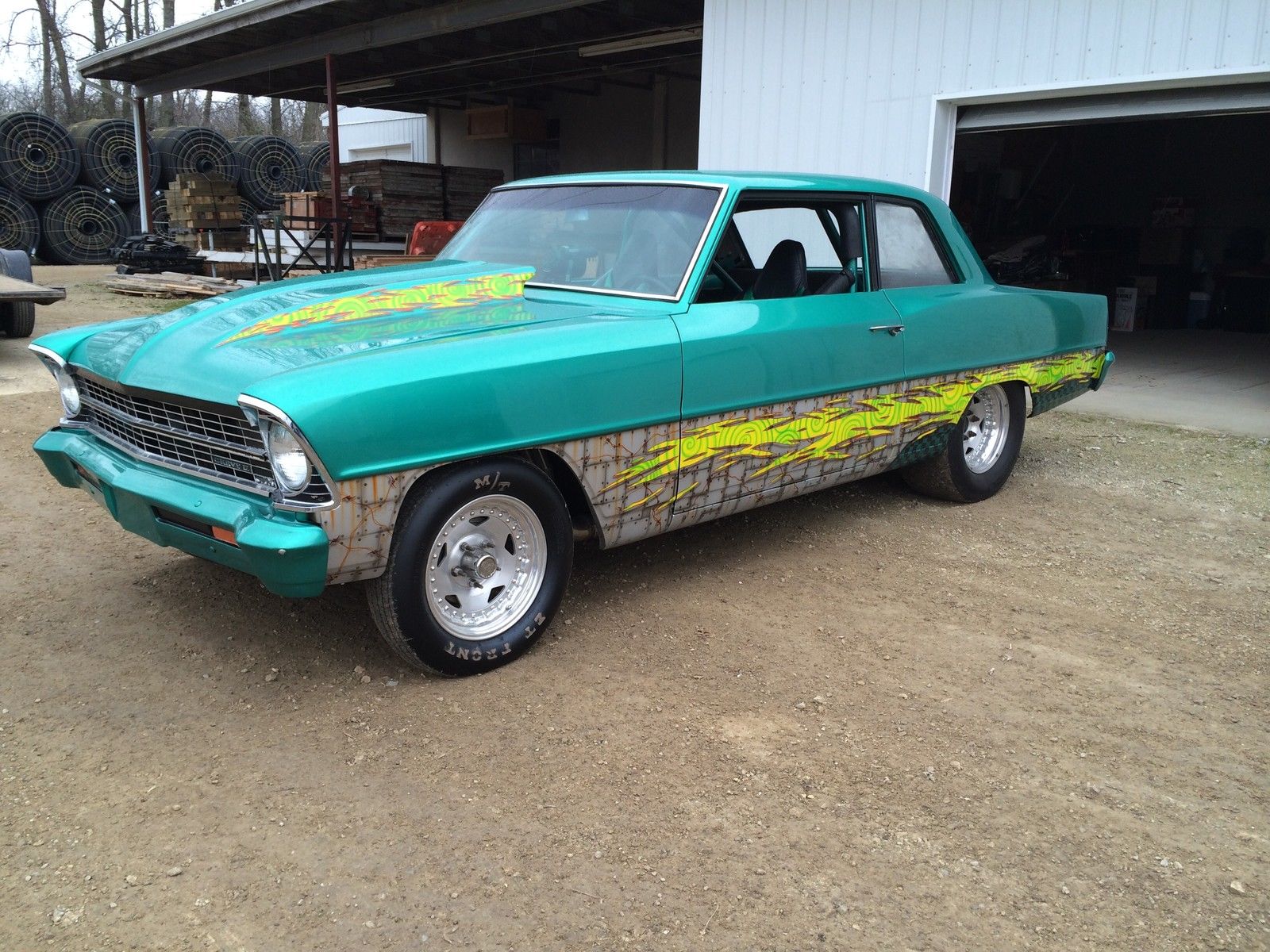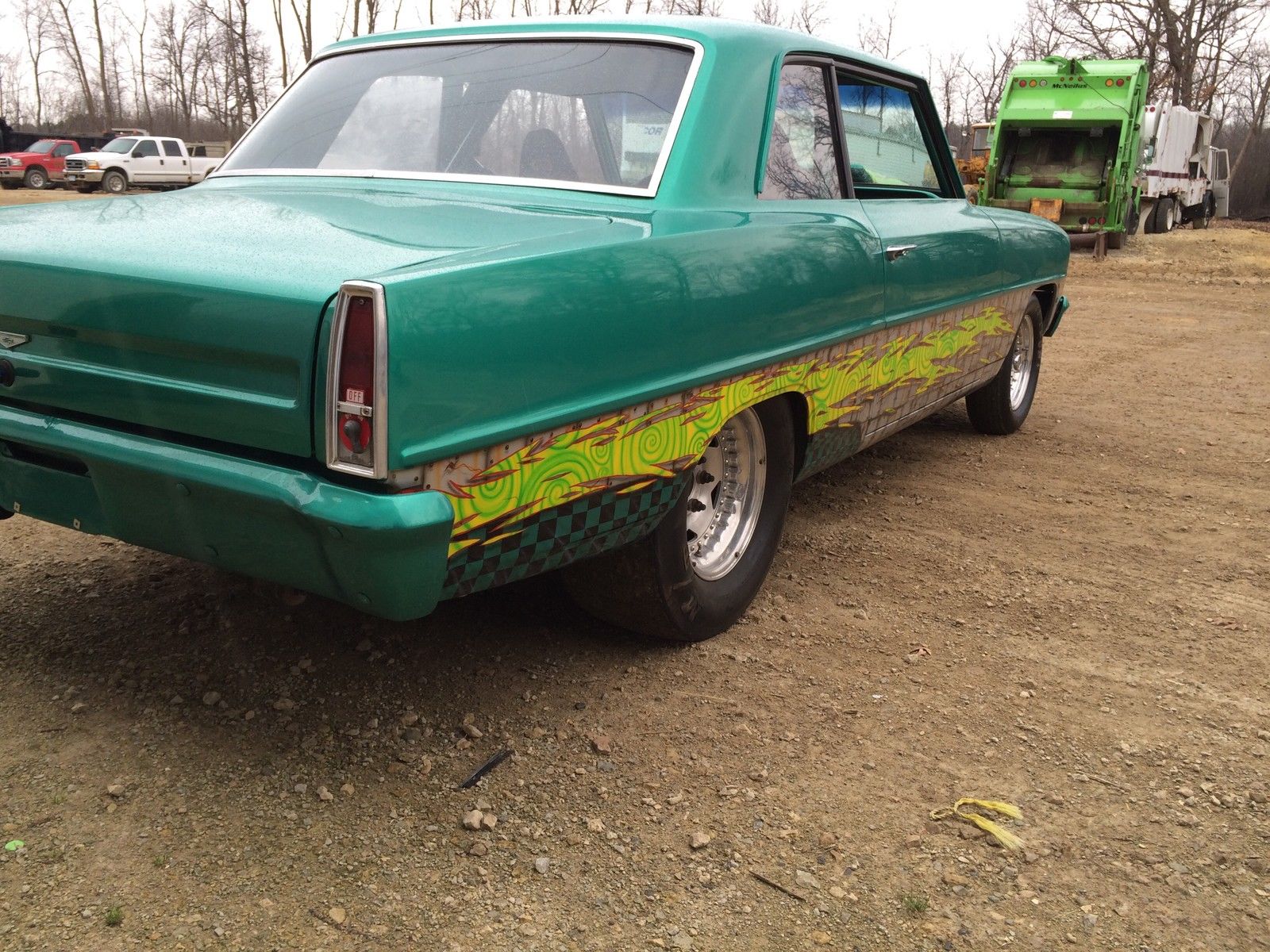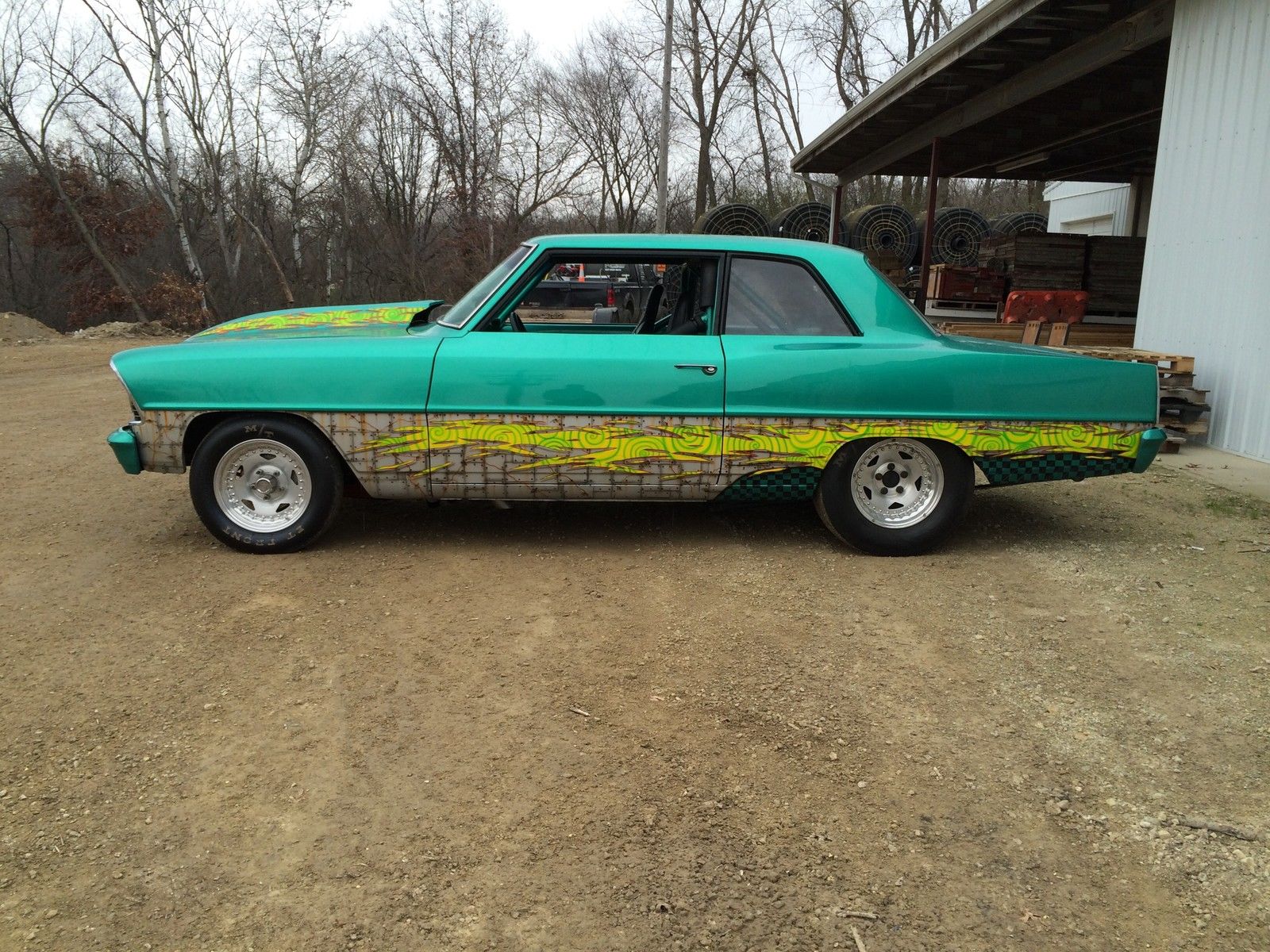 I have a 1967 Chevy Nova 2 for sale. This car is in excellent shape and body has no rust. It is set up as a drag car but could easily be restored to a street car. The motor is a 350 stroked to a 406 (500 hp) and only has a few passes on it. over 10. 00 invested in motor and trans. Transmission is a 2 speed power glide with trans brake. Msd ignition with rev limiter. Drum breaks with a line lock. Dana 60 rear end with drag suspension. Paint is in excellent shape. bottom half is air brushed(no decal). New Mickey Thompson racing slicks on center line aluminum wheels. Car would be a great for restoration. it's not all cut up for drag racing it would be easily put back to the street or just keep it as it is and race it. 1. 5 60 foot and 7 second 1/8 mile. The car has no title but you can get a bonded title for it very easily. thanks for looking. Call 507-202-3646 for any questions about the car