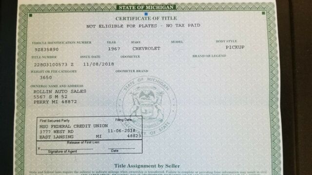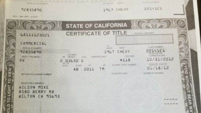 A CALIFORNIA SECRETARY OF STATE REPRESENTATIVE CAME OUT TO THE PREVIOUS OWNERS HOUSE TO VERIFY TRUCK AND USED FRAME# FOR THE VIN#. OWNER HAS BEEN DRIVING AND RENEWING PLATES FOR THIS TRUCK EVER SINCE. I HAVE A COPY OF HIS TITLE, HIS CURRENT REGISTRATION AND I ALSO GOT THE TITLE IN A MICHIGAN TITLE FOR RESALE WITH NO PROBLEM!! (SEE PICTURES)