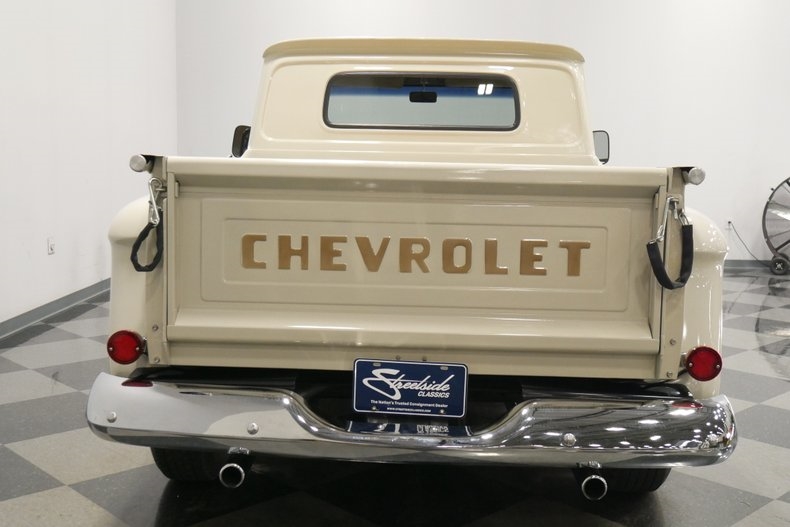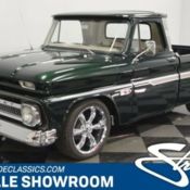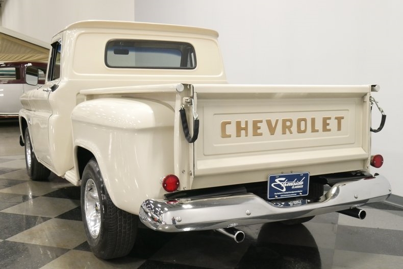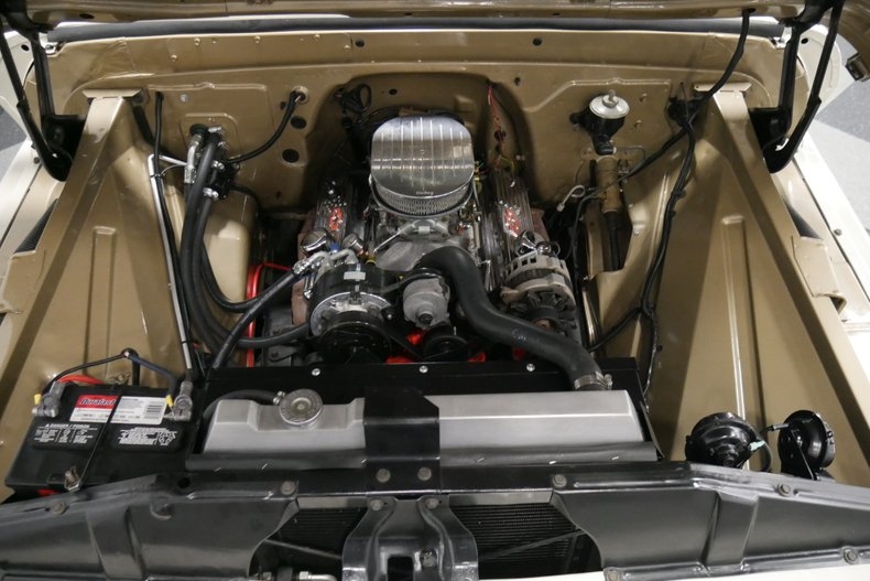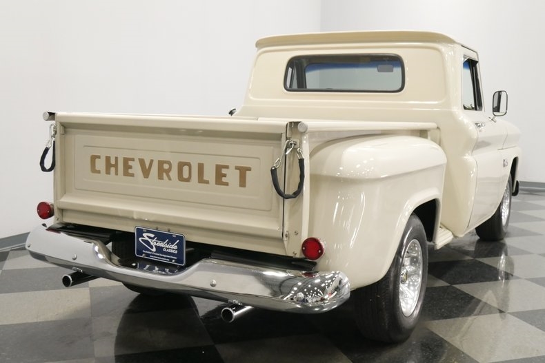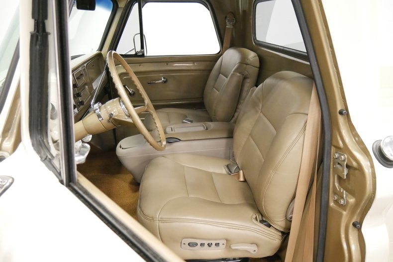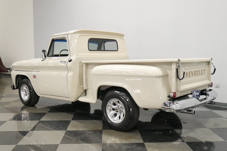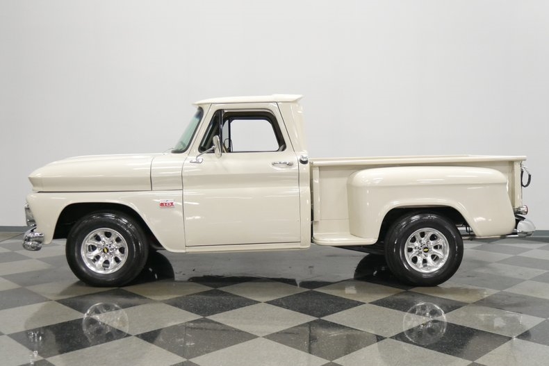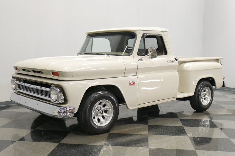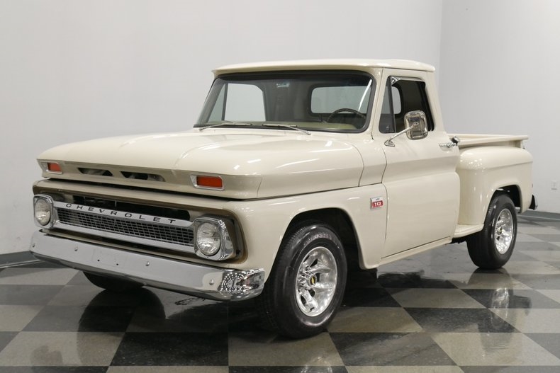 Vintage trucks are extremely popular right now, and if this 1966 Chevrolet C10 pickup is any indication, there's a bright future in old haulers. From the handsome Saddle paint and comfortable bucket seat interior to the rumbling 327 under the hood, this cool pickup offers a great update on the original design. Finished in mid-60s C10 shade Saddle Fawn, this truck is a looker. The stepside bodywork offers dramatic styling with lots of swoops and curves,... as well as brilliant use of subtle trim, and all of it remains 100% intact on this hauler. Other styling details include the wing-like lip at the back of the cab, which probably has no real function but looks really cool, and the neat crease that surrounds the entire cab. Paint and bodywork are done to a good standard, so this truck will be right at home both at local shows and on the streets afterwards. Unlike so many of these trucks, they avoided modern add-ons and stuck with factory-style sheetmetal and a single-color paint job, which always looks right. All the brightwork looks good too, from the massive front and rear bumpers and delicate egg crate grille (which looks new), to the neat side mirrors that look like industrial art all by themselves. The bed floor is done in oak, as was typical back then, and it's in such good shape that you might be afraid to use this truck as a hauler. Trucks were austere machines when they were new, but this one has had a full luxury upgrade during the build. The original bench was replaced in favor of supple late model tan buckets (driver's is a power seat) split by a middle console, tying in neatly with the plush carpets, original dash and painted door panels. Simplicity was the key so they didn't go overboard with upgrades, and while the build was obviously done a few years ago, it shows very little wear. The original gauges are a very cool setup with a single cover, along with a pair of auxiliary gauges installed under the dash to measure the engine's most important vitals. A restored wheel looks great and keeps comfort levels up, as does the R134 air conditioning that fills the cabin with cold air. Simple yet sophisticated, this C10s cabin is a very comfortable place to be. When the truck was restored a few years ago, a 307 cubic inch V8 was bored to a 327 with a 327 crank and nestled between the front fenders to make it runs as good as it looks. Vortec center-bolt aluminum heads, a Weiand intake manifold, and a Holley 4-barrel carburetor help make power, so it runs beautifully, and all the accessories were upgraded, including the alternator and a big radiator up front. A few chrome dress-up parts make it look good and the orange paint on the block provides a great contrast to the painted inner fenders and firewall. It starts easily with a great V8 rumble from the Flowmaster dual exhaust system, and with a 200R4 4-speed automatic transmission, it's easy to drive anywhere. The chassis is clean and presentable and shows off what clean living down south will get you and again, if you want to use your vintage pickup to get some chores done, this one will never complain. Cool later-model alloy wheels with Bowtie centers give it a muscular look, especially with those fat 235/75/15 blackwall radials. Still appealing, this cool old Chevy pickup demonstrates that things of quality have no fear of age. Call today!