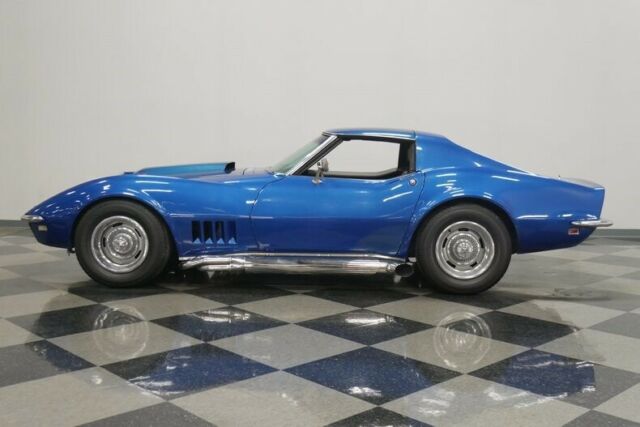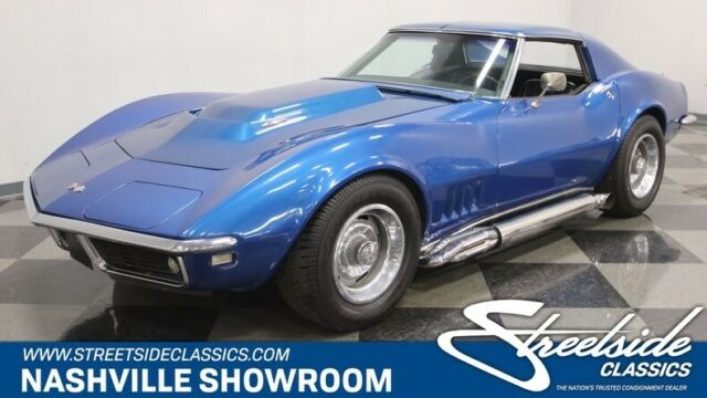 This 1968 Chevrolet Corvette hits all the high notes: a powerful 454 big block, a 4-speed, and a very attractive price tag. While the early Stingrays with 427s get all the attention, if you're looking for a great 'Vette, a chrome-bumper driver like this is the hot ticket. The body on this Stingray was refinished several years ago, but it has an authentic look that could almost pass for originality. There are few cars that will attract... more attention than a C3 with big block badges on the hood, especially when it's a bright blue big block hood that can scare children away. Roll up in this fantastic plastic and EVERYBODY notices. Of course, it doesn't hurt that the panels are straight, with good prep over well-preserved original fiberglass that has likely never been damaged. Corvette fans are sticklers when it comes to doing it as the factory would have, and with a good polish, the blue will really look great. Gaps are about par for the course on a C3, which again is a good thing for purists, and most fans prefer the chrome bumpers found on the early models. And if it's everyone's attention that you're seeking, nothing works better on a Corvette than chrome side pipes, and these shiny, wide beauties really do the trick. 1968 Corvettes were the only chrome bumper Vette's that got push-button door locks, and now that you've read that sentence, you can quickly discern between the years. And while you're on that conversation point while someone is gawking at this slick car, be sure to take off those awesome T-Tops and really finish off a great impression. It's likely the original interior in the car and black makes for a very upscale and inviting passenger compartment. There's some wear, but it also has a comfortable, lived-in look about it with much of the components still in good shape. The quick-shifting 4-speed manual transmission has a bright chrome shifter with a cue ball shifter, which was a Corvette hallmark for many years and the gauges show original, clear markings that are easy to see at a glance. Other goodies include an original-style 3-spoke steering wheel, the factory AM/FM radio in the original slot, and those cool fiber-optic bulb indicators in the console. Yes, there are a few signs of age, but we have to admit that we'd hesitate to replace anything since it all looks so authentic. Still hard to believe something like this is so affordable, isn't it? This C3 will also eat lesser machines on the road for breakfast, thanks to the swapped in 454 big block under the hood. With stout horsepower, it's the smart choice for the guy who likes to drive his Corvette. Reliable and virtually indestructible, the 454's wide torque band makes it the ideal powerplant for long-distance cruising. Again, it looks well-maintained with Chevy Orange paint on the block, finned Corvette valve covers, a finned Holley air cleaner, and it really runs great. The afore mentioned side-pipe exhaust gives it a thumping rumble, not to mention an indistinguishably killer look. Modest street-friendly gears combine with the big block's mountainous torque curve to make acceleration entertaining at any speed and clutch take-up is smooth and progressive, making it very easy to drive. Rally wheels give the 'Vette a traditional performance look and they're wrapped in fat 225/60/15 blackwall radials. Big block Corvettes aren't getting cheaper, so take this opportunity to put a dialed-in 4-speed C3 in your garage for under $30k. Call today!