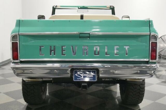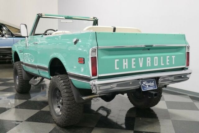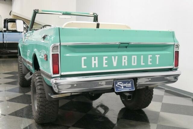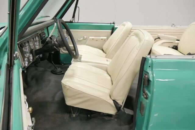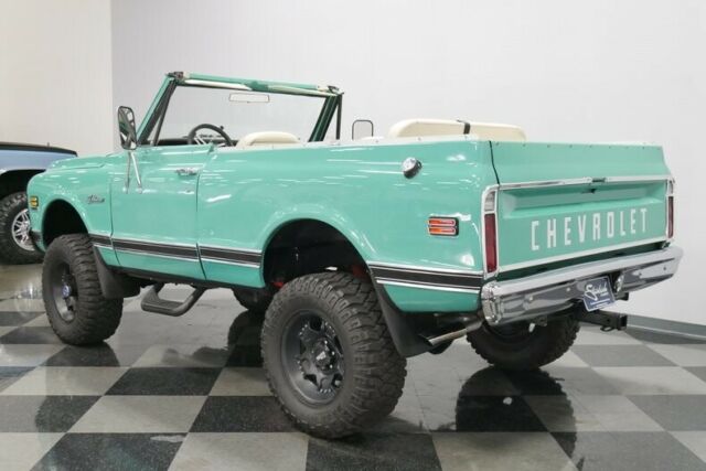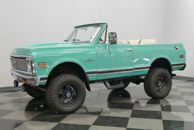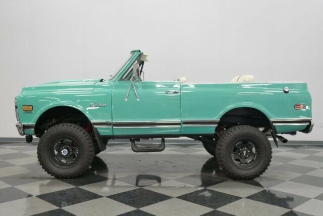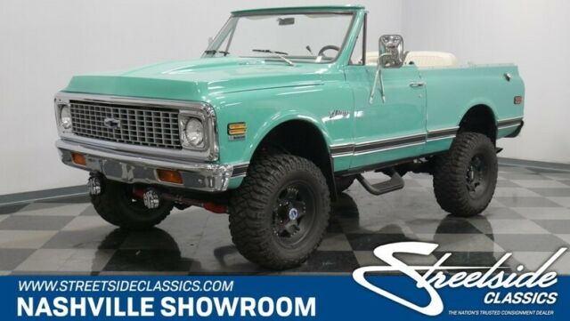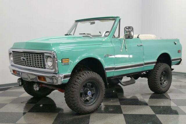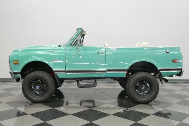 Jeep invented the personal 4x4, Ford made it popular, and trucks like this 1972 Chevrolet K5 Blazer perfected the breed. Blending just the right amounts of go-anywhere truck durability with creature comforts and practicality, the Blazer was a mainstay of popular automotive culture for decades, and few are better suited to that legacy than this nicely restored 4x4. The handsome Medium Green paint was applied a few years ago and still looks good on the Blazer's squared-off... body lines. There's plenty of Chevy pickup truck DNA in there, but who can argue with the result when it looks this good? The proportions are ideal for a big yet personal SUV, and with plenty of soft and hard top options available on the secondary market, it's fairly easy to transform it from a fun-in-the-sun machine to an all-weather driver. The idea of having fun in this truck was clearly the driving force behind the freshening, since it isn't trailer queen perfect, but rather a nice blend of restored and original components that ensure you won't think twice about climbing behind the wheel and putting it to use. It fits together quite well, the doors close easily, and that big hood doesn't need a massive slam, and there's no evidence that it has ever been wrecked or abused. The simple chrome grille and front bumper with KC lights mounted underneath, a few modest badges, and a shiny rear bumper with a hitch add just enough sparkle to make this truck feel at home anywhere it goes. Twin bucket seats with white vinyl seat covers, a heavy-duty, durable black vinyl mat, and matching white door panels anchor a stylish and functional interior. Today, we might find the inside of the Blazer absurdly spacious, but that's the great thing about old vehicles like this, particularly when they're also practical and functional. There's a matching white cover on the rear bench, too, making this a comfortable 5-passenger vehicle that'll truly go almost anywhere. Sparkling gauges are some of the best you'll find in a truck and they're framed by a newer three-spoke steering wheel that's beefy enough to look right in the full-sized Blazer. A modern stereo radio fits in the dash like it was born there, so your music can come with you, and it's hard to imagine a better vehicle for playing outside. Open the tailgate and even with the back seat in place there's still plenty of cargo space for just about anything you'll need. The 350 cubic inch V8 under the hood is the perfect companion if you're going somewhere remote. With an Edelbrock 4-barrel carburetor and a few chrome dress-up parts, it might look more at home in a Camaro, but it works just fine in this big 4x4 as well. Installed only a few years ago, it runs superbly, starting easily and idling with a muscular rumble from the custom dual exhaust system. The engine bay is dominated by the big chrome air cleaner, but if you look carefully you'll see a lot of new components, ranging from the tune-up parts to a giant radiator. It's backed by a 700R4 4-speed automatic transmission, which is a rather rare find, plus a 2-speed transfer case that feeds power to the axles at both ends. With its proper lift, it'll climb over big obstacles and upgraded shocks keep it from being too rough a ride. Slick MOTO Metal wheels are blacked-out and fitted with massive 33x12.50-17 Mickey Thompson off-road radials complete to the go-anywhere look. Big Blazers are big fun, and with this southern truck that's ready to hit the trails, you can combine work and play without changing a thing. Call today!