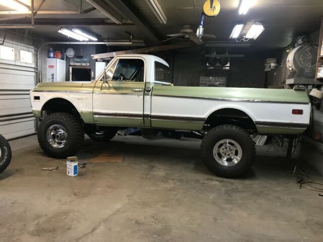 Lost interest project...Rustfree long bed C10 factory air cond body from Iowa on a rustfree 71 K20 frame from Va that was blasted and painted.Has a rebuilt .030 over 1969 chevelle 396,350 transmission,np205 transfercase,1979 1 ton single wheel rearends,dana 60 front,corp 14bolt rear,both have disc brakes and 4:10s.Brand new 17x9 aluminum slot wheels with BFG km2 37x12.5-17 tires,and much much more.STARTS,RUNS,MOVES.In primer,needs blocked once more,sealed,painted,exterior chrome installed, new interior installed and 1 rear cab mount needs repaired.Most parts are new or rebuilt,has all orig GM sheetmetal.Have all parts to complete,mostly new exterior,super mouldings,emblems,recovered houndstooth seat,headliner,carpet.Truck was green and white,grn int.Over 23K inv and 4mos time.NO TRADES.