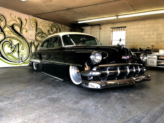Chassis:One off front frame stub with independentfront suspension, all built at Hale'sFront suspension rides on Ridetech ShockWave HQ Series airbags2 link rear with Firestone airbags and Ridetech HQ Series shocksShaved frame rails to lay car just before the rockersChassis was base/flat cleared in booth before final assemblyFront disc/Rear drum brakes with hydro-boost and Wilwood master cylinder