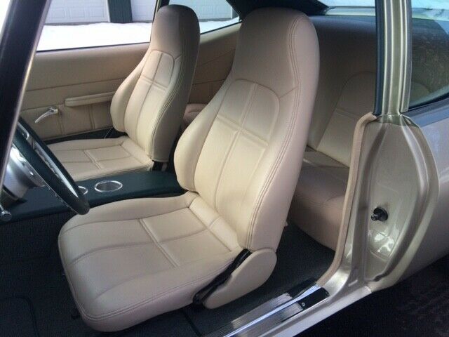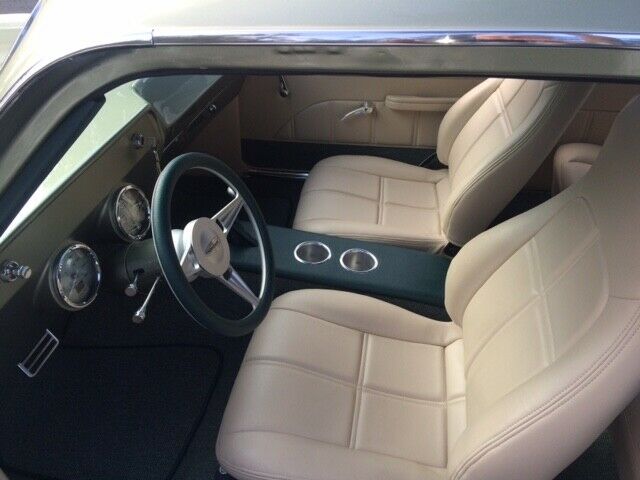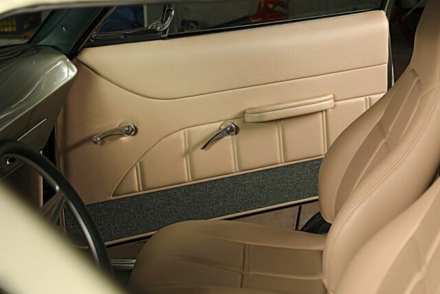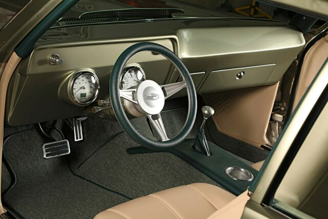 The interior is high grade vinyl in light beige with square weave wool carpet in jade green. Custom made console with Lokar shifter.All metal custom dash with gauges by Speedhut. Radio is located inside the glove box