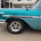 EXTERIOR: Laser straight with a reflection you can read a newspaper in. Outstanding body and paint by the Kandy Shop . The body was stripped to bare metal, epoxy coated then a base coat clear coat finish was applied. It was block sanded and polished like glass. Has all the stock trim and chrome, every piece replaced or restored. Every piece of glass was replaced. Every weatherstrip and gasket was replaced. The wheels really stand out, big chrome 22s in back and 20s in front. Each wheel has a thin dark red stripe that's a nice touch.INTERIOR: Very classy. The rich leather upholstery was expertly designed, stitched and installed. Expertly cut and installed carpet all with sewn edges and floor mats to match. The dash is beautiful. The black metal is painted as smooth as the exterior. Has a really nice set of gauges including a tachometer. Vintage Air and Heat controls are in original location. Also has a tilt wheel, a floor mounted Lokar shifter, power windows and even power vent windows. The headliner still features the chrome ribs. The stereo system is hidden. Head unit is in glovebox and speakers are hidden behind perforated holes in the side panels.