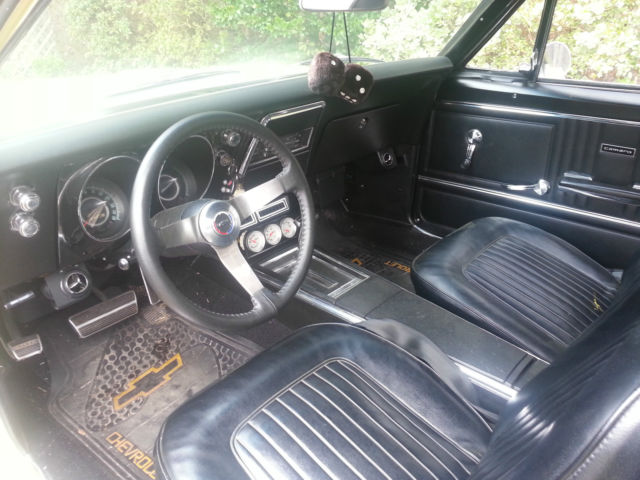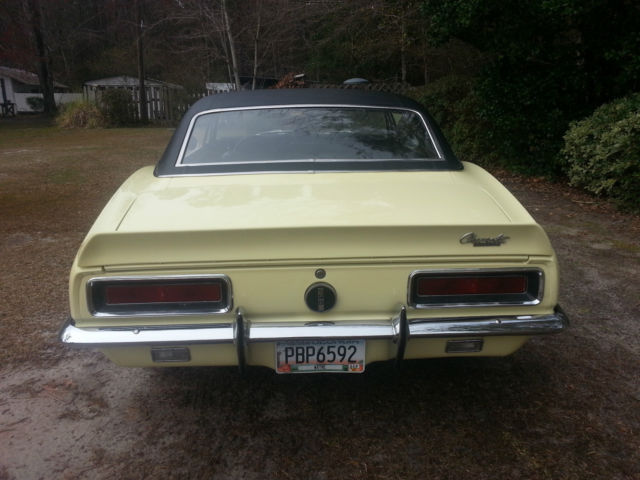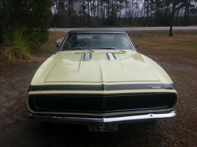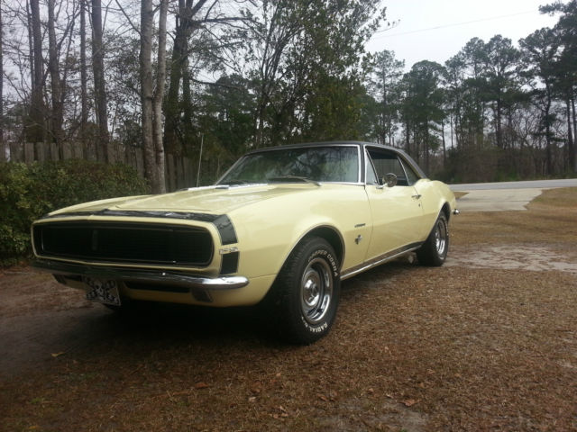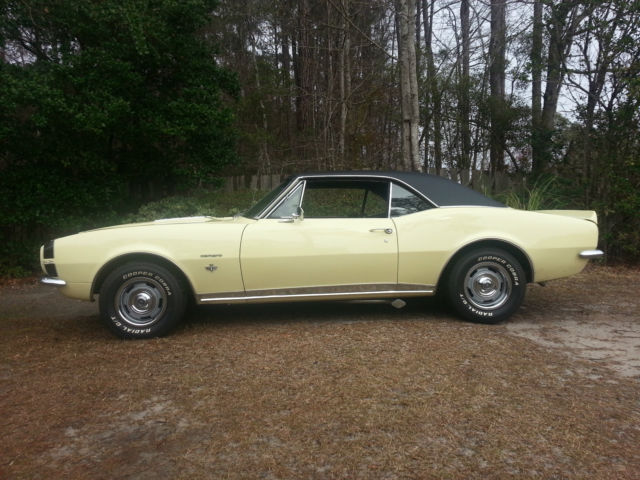 bUp for sale is an immaculate 1967 Chevrolet Camaro RS. The car is not numbers matching. but includes a new 350 cubic inch V-8 and an automatic 700R transmission (with overdrive). The exterior is butternut yellow and the interior is black. The vinyl top is black and is in perfect condition as is the paint. Please note in the photos. the steering wheel has been upgraded. but the original wheel is included. This Camaro sports the correct Rally wheels and tires which are like new. It also has air conditioning. The car is very quick. handles well. and sounds amazing. It also has lake pipes installed which can be un-capped and really makes an amazing sound by bypassing the mufflers. When capped. it also has a mean gurgle. Please ask any questions prior to bidding. Shipping is the responsibility of the buyer. Assistance can be given with this. as there are a number of shipping companies in the area. Also. delivery is a possibility by the owner for a fee if not too far away. I am listing this for a friend. so I can answer some questions via email. but I recommend calling him directly so you can get a true representation of the car. His number is 912-427-2386 and his name is Bones. A deposit via PayPal is due within 48 hours of auction's end and full payment via certified bank check or Postal Money order within 5 days. Thank you for looking and please note my perfect feedback and bid confidently.