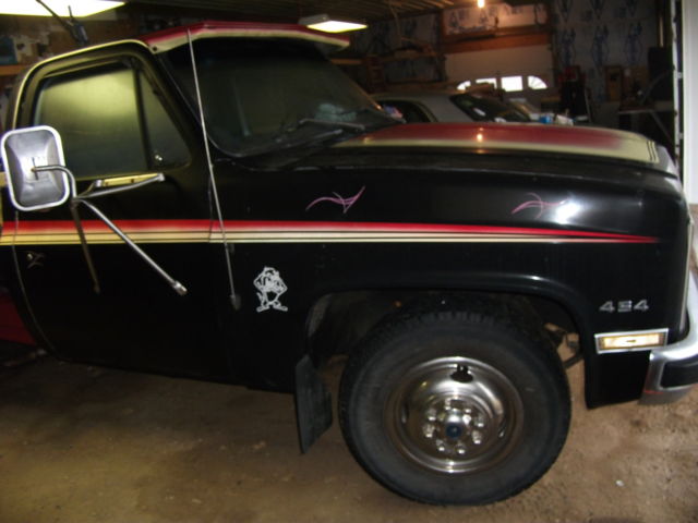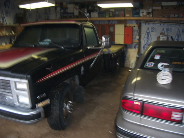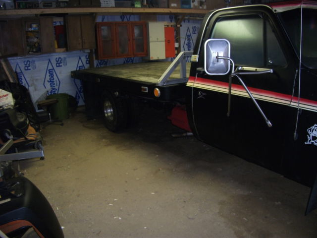 HERE IS A 1977 CHEVY TRUCK 1 TON DUALLY WITH A STEEL & WOOD BED. BOARDS ARE TUNG & GROOVE 11/4 THICK. HAS REESE HITCH SET UP FOR TOWING 7 PRONG PLUG IN. THIS TRUCK HAS A 1981 CAB & DOG HOUSE WITH ALL NEW PARTS. THIS IS A RUST FREE CAB. HOOD / FENDERS / INNER FENDERS / DOORS / CAB CORNERS / ROCKER PANELS ALL BEEN REPLACED. ITS BLACK WITH RED / YELLOW STRIPPING. INTERIOR IS ALITTLE CUSTOM MADE. STILL HAS ORINGINAL BUNCH SEAT BEEN REDUNE A FEW YEARS AGO. HAS AM/FM/ CD PLAYER (new). HAS A 454 CU. IN. MOTOR ALL DECKED OUT. HAS DUAL TANKS. THE RIMS ARE ALL FARELY NEW 16" WITH SIMULATORS ALL WAY ROUND. TIRE ARE STILL IN GOOD SHAPE. THIS TRUCK HAS BEEN OWNED BY ME SINCE 1990. MY FRIENDS SAY ITS A KICK ASS TRUCK. ITS READY FOR YOU TO PUT IT TO WORK. NOTE THIS TRUCK IS KEPT IN A BARN ALL WINTERS. ONLY TAKEN OUT IN THE SPRING. THANKS FOR LOOKING.