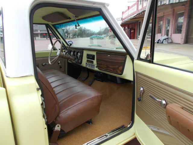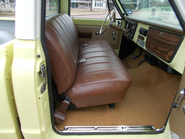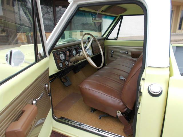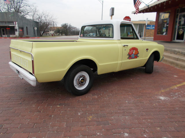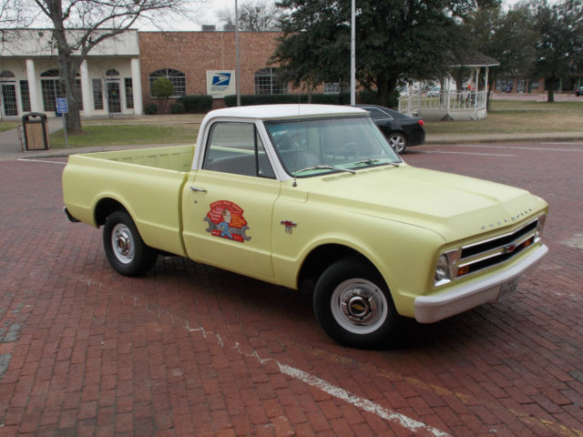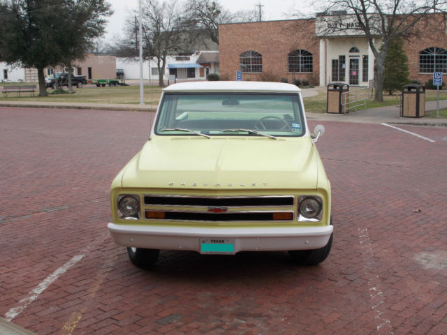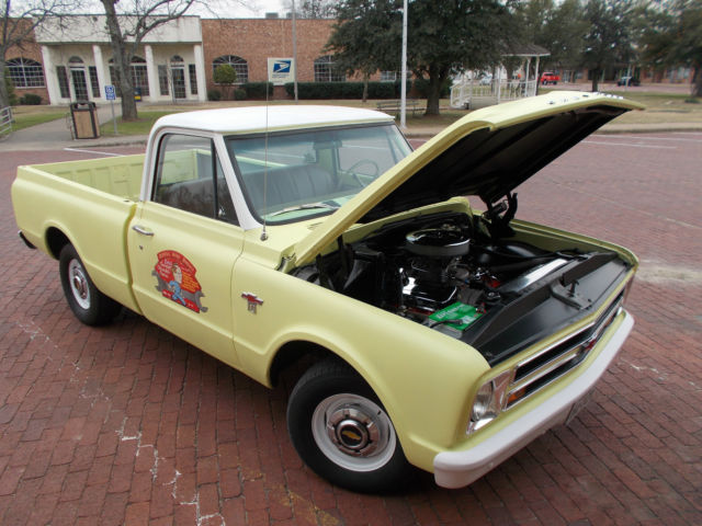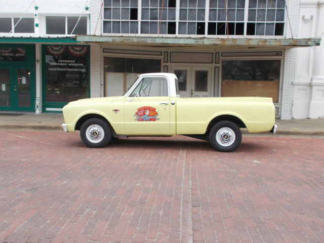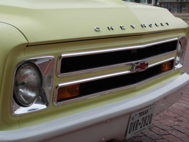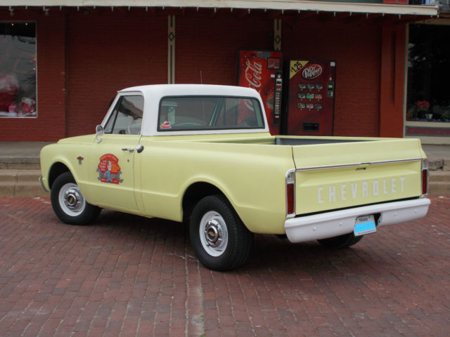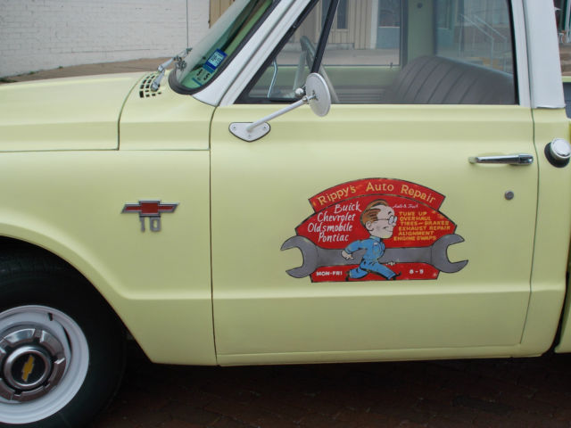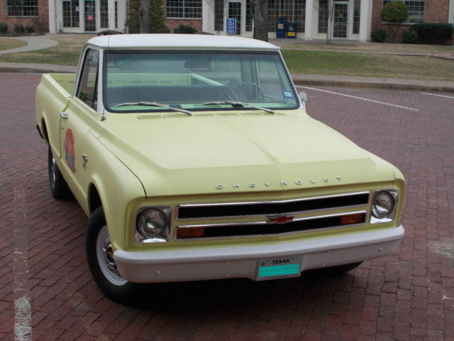 1968 C10 shop truck build by design. Offered for a limited time is a frame off shop truck recently completed with 1000 miles on engine/trans/susp/tires etc. Build was started 2012. This truck was purchased for this style build/design. The C10 was originally red/orange/swb stepside/v8/3spd column shift from vin research. The swb truck when purchased had a straight body with minimal rust. hite (older) paint job. 50/350 engine/trans. anded interior/5 lug conversion/auto trans steering column. Engine/trans pulled/sold. Truck was dis assembled. rame/trailing arms/cowl/ were soda blasted/painted. Chassis rebuilt front to back. The 454 was purchased from a running 80's C60 "SNAP-ON" tool truck and rebuilt/tested/break-in by HARTLINE MACHINE. odd City Tx. The TH400 was purchased from a local car builder out of a 1969 396 Chevelle. rebuilt by Kuston Built Transmissions. Denison. x. Stepside bed replaced with fleetside bed which was a long fleet bed shortened to short fleet. All the short fleetside beds we found were in unsatisfactory condition . We found 2 long fleetside beds. 1st one nice. nd nicer condition. t was chosen using correct procedure to shorten. Inside bed prepped/primed. ed floor was prepped/coated with 2 coats of POR15/black. Body/int was sanded/prepped/primed with a yellow primer. ab white primer. We use a process on the primer to give the effect of a faded paint job. Alot of people think it's paint. The primer used is compatible with all laquers/urethanes/primers. Custom painted door logo(my style). Stock new coils front/back with CPP 1. 5 lowering blocks/u-bolts in back. New int/orig bench seat. nt is simple/clean/plain. The molding/wheels/hub caps designed to give a simple clean look. nd BFG radial TA's to complete the truck. Below is a list of facts/figures on this build. This truck rides/feels/sounds/steers/stops like a 68 C10. not a car. Fresh alignment and manual discs up front with the CPP sway bar kit performs nice. This little thumper is reminiscent of the 70's hot rod trucks running around our town at that time. Our builds are unique from the bling or skeletons/spiders/flat black paint. I do like rat rods but this is not one. This is a custom shop truck/muscle truck. The truck is a blast to drive and sounds vintage. You can cruise or. scat. The truck is very powerful. Alot of questions/looks/thumbs up/seniors interest. urprise when the hood is lifted. The initial plan was to plate the bed floor with 3/16 for weight/better traction. ecision was to leave it stock for now. to much fun to drive. You can break the tires loose at will. his little truck moves out strong. ull's hard. he's QUICK. The tach reads around 3000 at 70mph which is why the 3. 08 limited slip was chosen with the 3 spd TH400. The truck has been "babied" during break-in period. The cam choice was kept mild creating hp but smooth idle along with the new Holley she feels good. You can hear the Comp cam with very little vibration. With the glasspacks it has that BBC sound. risp but not too loud. This was built to be a driver/weekender. This truck has less than 1000 miles and driven around town and a couple highway trips. tays inside a shop when not driven. No rain/snow/mud has touched her. This truck needs nothing unless desire to take to another level or add to it. Frame off build. Many hours in this truck. Clean/plain/reliable/quick. our style. our build. next build coming soon. CHASSIS> FRAME:stock(blasted/painted) REAREND/RATIO:stock GM 12 bolt limited slip/3. 08 ratio(serviced/painted). lug conversion. REAR SUSPENSION:New moog coils. ew panhard bar. ew CPP 1. 5" drop blocks/u-bolts. ew control arm bushings/bolts(orig control arms blasted/painted)new monroe shocks. ll new cast parts painted with cast coat. REAR BRAKES:stock drum . ew drums/shoes/lines. FRONT SUSPENSION:stock. ew upper/lower a-arm shaft assembly(both sides). oog springs. all joints. -bolts. onroe shocks. ump stops. PP sway bar kit. -arm bumpers(orig a-arms stripped/painted)all new cast parts cleaned/painted with cast coat. FRONT BRAKES:5 lug disc. new-rotors/calipers. ads. ines. earings. ust shields. STEERING BOX:new stock power steering replacement/lines/ps pump. ie rods. dler arm. itman arm. ag joint. FRONT WHEELS/TIRES: new GM 6x15 steelies. ew BF GOODRICH Radial TA'S 235/70/15. orig stainless 69C10 hubcaps in exc condition. REAR WHEELS/TIRES:new GM 6x15 steelies. ew BF GOODRICH Radial TA'S 275/60/15. orig 69C10 stainless hubcaps in exc condition. GAS TANK: new stock replacement (behind the seat)tank/sending unit/panel gas tank cover/cap. DRIVETRAIN> ENGINE:454/040 over/260H Comp cam. PP engine mounts. HEADS: early GM 049 big valve heads. illed/serviced. ew Comp valve springs. VALVE COVERS:BBC chrome. MANIFOLD/INDUCTION: early Weiand 8005 alum BBC intake. ew Holley 3310s/750cfm manual choke. okar throttle kit. hrome breather. ARL"S fuel filter. IGNITION:new dist/HYPERTECH power coil kit. aylor High energy wires. M rapid fire's. igh torque mimi starter. HEADERS: Summit truck headers1. 75 o. d. . HT high heat white. EXHAUST/MUFFLERS: Speedway 2. 5 hotrod exh kit. HRUSH 2. 5x28" Glasspack's. xhaust dumped over rear axle. TRANSMISSION:TH400/rebuilt. ew-Lokar kickdown cable. peedo gear/cable. PP trans crossmember kit/trans shifter linkage. ummit street flex-plate. lex plate cover. egs alum trans pan. ines. ustom built driveshaft with spicer u-joints/new th400 trans yoke. SHIFTER: stock colmun. ew shifter column indicator. BODY> STYLE: 1968 C10 swb fleetside. MODIFICTIONS: unnecessary holes filled in firewall. ong bed shortened to short bed. enter bed stake holes shaved. ide marker lights shaved. ew reproduction tailgate. onor 1969 c10 pass side door. river side rocker replaced(very little evercoat filler/3M glazing filler used on this build). FENDERS/HOOD: stock GRILLE/TRIM: new chrome on grille/headlight bezels/cab divider/tailgate/tailight bezels. PAINT/COLOR: pale yellow primer on body/white primer on cab. high heat low gloss under hood/f