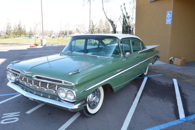 View Our Other Listings | Contact Us | Print this listing *** BEAUTIFUL - ALL ORIGINAL - 1959 CHEVY BEL AIR 4-DOOR SEDAN ***Robz Ragz108 W. Bower St. Meridian. ID 83642Call Us Today(208) 860-1171Ask ForRobAsk Us A Question Vehicle DetailsYear: 1959Make: ChevroletModel: Bel Air/150/210VIN: D59J159429Mileage: 78229Transmission: AutomaticEngine: 8 Cylinder. 283 CID LExterior Color: GreenInterior Color: GreenTitle: Clear *** GORGEOUS 1959 CHEVROLET BEL AIR 4-DOOR SEDAN - ALL ORIGINAL SURVIVOR!! *** *** 78. 29 ACTUAL - ORIGINAL MILES SINCE BRAND NEW !! *** *** THREE OWNER SINCE BRAND NEW-THIS CAR IS LOCATED IN VISALIA CALIFORNIA!! *** *** THIS CAR IS STUNNING AND IS KEPT IN THE ORIGINAL CONDITION!! *** *** 100 ADDITIONAL PICTURES BELOW DESCRIPTION !! *** Are you looking for a GORGEOUS - one of a kind Classic Survivor 1959 Chevy Bel Air 4-Door Sedan with tons of nostalgia? Want to own a real eye catcher and only one of the finest examples of a surviving ORIGINAL will make you happy. this is it. What a value it is at the reserve price which is set very low ! Yes this is one GORGEOUS 1959 Chevy Bel Air 4-Door Sedan and it only has 78. 29 ACTUAL - ORIGINAL MILES since brand new and has always been garaged and it shows! We are selling this car for a collector friend of ours that is moving into a new house and it will only fit 20 of his 40+ cars. so he is thinning his herd. (Poor baby. but lucky you). It's hard to describe how NICE this 1959 Chevy Bel Air 4-Door Sedan really is. Survivor Classic cars this nice don't come along very often! The color combination of – Original Code "953F" – Ermine White and Green exterior paint with a PRISTINE – ORIGINAL - Code "822" – Green and White Vinyl interior on this BEAUTY is STUNNING to say the least! Even all of the ORIGINAL light lenses and reflectors are still clear. bright and in NICE shape. This is a tight and solid 1960 Chevy Biscayne 4-Door Sedan which runs EXTREMELY well. If you can make it to Visalia California in the next ten days you really need to come and look at this BEAUTY for yourself. you won't be disappointed. THIS IS A ONE OF A KIND - QUALITY CLASSIC SURVIVOR CAR FOR SURE! It still retains its VERY STRONG - ORIGINAL – 283 CID V8 motor with 185HP and it runs GREAT. The Original Oil Bath Air Cleaner housing and OEM valve covers are still on the engine. The engine is backed by a smooth Powerglide two speed - automatic transmission that also functions very well. The All ORIGINAL - Code "822" – Green and white vinyl interior is what I would call PRISTINE. shows very little to no wear. with a VERY NICE ORIGINAL Green and White front bench seat. VERY NICE ORIGINAL Green and White rear bench seat. VERY NICE ORIGINAL dash. VERY NICE ORIGINAL gauge cluster. Nice ORIGINAL Green painted dash. VERY NICE Deluxe steering wheel. VERY NICE ORIGINAL matching two tone green and white door panels as you can see in the pictures they have the Original Chevy coss-flags embossing on them. The drivers door has a crack in the top but all others are in great shape. NICE ORIGINAL Green floormats. VERY NICE ORIGINAL sunvisors. VERY NICE ORIGINAL headliner. working dome light. All the interior window crank and door handle chrome is very nice. In my opinion you’re not going to find a nicer ORIGINAL style interior on a 56 year old car than the one in this Sweetheart! This Beauty is quite a deal and you will be happy with your purchase. This '59 has outstanding looks. smooth power and a SUPERB RIDE! This BEAUTY is a pleasure to drive and I assure you it runs and drives very well. I drove this car around for a couple of days. running errands and on the freeway and it is such a nice driver. it went 65-70 MPH no problem. No wondering or pulling to one side even when applying the brakes. what a cool car. After driving it I had to look twice to see if it had power steering it was such an easy driver. These vehicles have an appreciative group of owners any of which would be pleased to own this one for sure. The suspension is in nice working order as well as the electrical system. This 1959 Chevy Bel Air 4-Door Sedan is a good investment opportunity and it is priced right! This vehicle is in good condition from top to bottom and from front to back. Again. THIS IS A QUALITY. It will not disappoint someone looking for a good example of a sought after and hard to find Classic Chevy survivor Car. If you have been looking but cannot find a nice Classic 1959 Chevy Bel Air 4-Door Sedan worthy of your hard earned money look NO further because this is the one!The – ORIGINAL Code "953F" Ermine White and Green exterior finish on this vehicle is Beautiful showing some imperfections "Patina" on the car but is polished and is STUNNING as you can clearly see in the 100 pictures below! The Original Green and White two tone interior is also BEAUTIFUL! what a GORGEOUS color combination! How could you get any better? The trunk has some minor surface rust and original style trunk mat with full sized spare tire. This car is loaded with original working deluxe push button radio dual speed windshield wipers. Deluxe steering wheel. in beautiful Original shape. painted dash (no cracks or fading). original rear view mirror and dual Original chrome exterior mirrors! This car is ready to go!! It is in WONDERFUL mechanical condition and it runs and drives superbly. This vehicle is beautiful with respect to the overall cosmetic impression. Check out the ORIGINAL chrome and stainless on this Chevy Belair. In my opinion you’re not going to find much nicer ORIGINAL chrome and stainless than what’s on this car. It does not get much better! It has BEAUTIFUL - Chevrolet Wheel Covers and older whitewall tires that will need replacing soon. I looked underneath and also included photos below. This is a NICE - SOLID - PAMPERED - LOW MILEAGE vehicle that was kept inside and it shows. Look at the pictures of the ORIGINAL FLOORS. in my opinion you’re not going to find any better! All of the ORIGINAL 