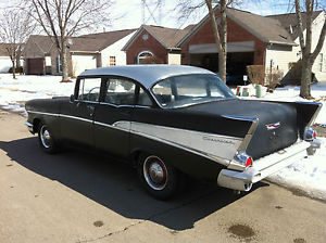 1957 Chevy 4 Dr. Model 210 . Wow !Mechanically:It has a 350 V-8 with Headers. Glass Pac's. Duel Exhaust. and Sounds Fantastic !Has Auxiliary Fan (In Front of the radiator) for those really hot days3 Speed on the ColumnBrakes and Clutch are in great shape. Exterior:There is Zero Rust on the body of this Chevy !All around the doors. top to bottom are Rust Free. Trunk 100% Solid and Rust Free. nbsp;Rockers are in great shape !Floor pans are sold front and back. Primed ready for paint. or leave as it is ?Yesterday. I primed the rear bumper to match the body. The Interior:In good shape except for a few places on the front and back seat. All window trim in very good shape for the age. The car has the original factory mat style floor. No CarpetNeeds a headliner but. all trim and cross bars are there so not expensive to put one in. Glove Box Door is there but Glove Box missing. Horn does not work. Windshield has a crack and passenger front and rear glass has a crack. All door handles knobs lock and unlockThe key does unlock the drivers door. so the car can be locked up for safety. Working Items:Heater Works. Gas Gauge Works (Yahoo) . Speedometer Works but makes noise. Head lights Work. Brake lights Work. Turn Signals Work . and License Plate light works. Head Liner Light Works when you open the door. Just Installed SunPro after market gauges Water. Oil. and Amp. The 57 Chevy keeps low temperature and has over 40 lbs oil pressure at a idle after its warm. Driver side windshield wiper works not the passenger? Vacuum type wipersRear end differential leaks a little. Tires are like newNew:Just Installed New Rear Leaf Springs and all associated parts. And. New Monroe Air ShocksIt is hard to find a Chevy in this condition with no rust at this price. She Fires Right Up and Sounds Great. Listen to the video. Please have the money available if you are the winning bidder !No Negative or Zero Rated Feedback Bidders Please !Car is sold as is No Warranty. Deposits are Non-Refundable. I have a perfect eBay rating and have described the 1957 Chevy the best I can. If this doesn't hit my reserve? I am happy to keep it. cruise around town. take it to car shows. and enjoy it this summer !Thank You,