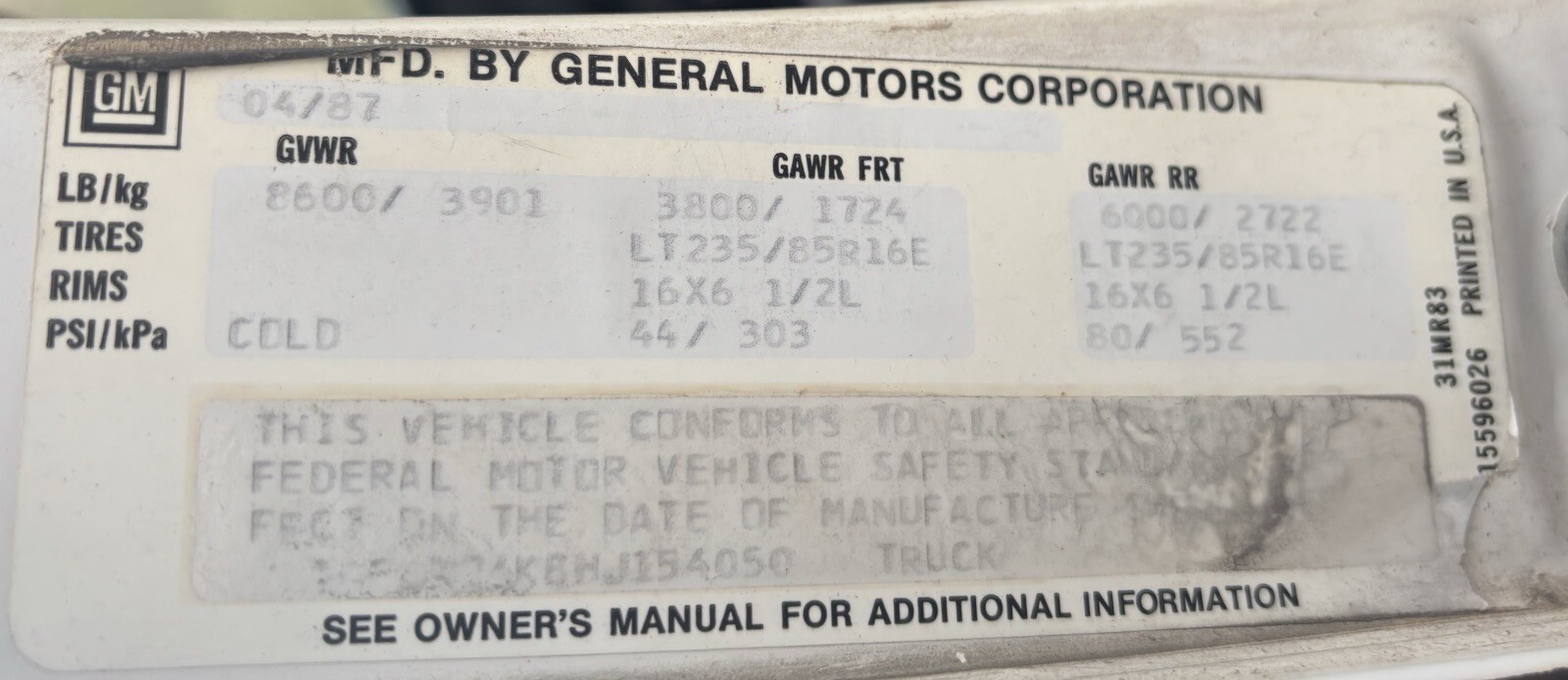 | VIN: | 1gcgv24k8hj154050 |
