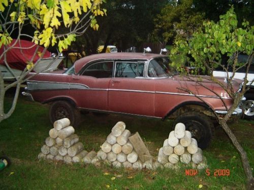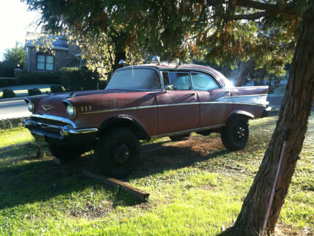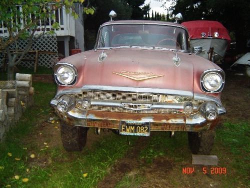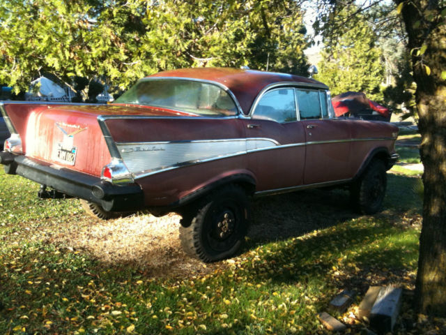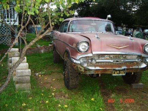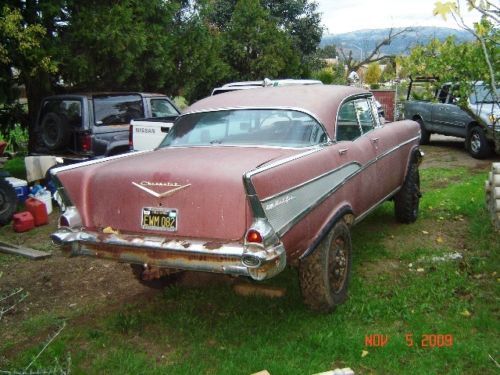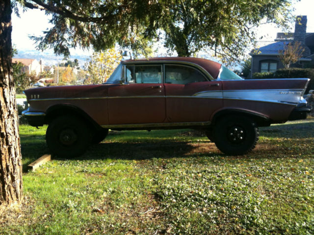 Hello there and Good Day and thank you for taking the time to look at my ad. What we have here is a 1957 Chevy!!! (kinda) Description THE BODY: a mostly original 1957 Chevrolet Bell-Air 4 Door Hard Top (which includes all interior furnishings and moldings. and exterior furnishings and body moldings. although the original car stereo is missing and behind the glove compartment door the original glove box is missing and the trunk lid key lock is removed. THE UNDERCARRIAGE AND RUNNING GEAR: a 1941 4 wheel drive. One Ton Military. Weapons Carriage. The 4 wheel drive should still work and it was parked with it still operable. ABOUT THIS AD: The person posting this car for sale lives in Reno. Nevada and the car is parked in the South Bay Area in California. The car was last registered sometime in 2012. TO REALIZE AND TO MOST CONSIDER: The car needs to be restored and I don’t believe anyone should spend any money on this car to try and use the engine as is or any of the parts that are on it as is. I recommend for anyone to buy this car that going into it. is for the sole interest of the ’57 body and it’s rarity (the state or quality of being rare) So any buyer should figure on pulling the engine and performing a complete rebuild for the engine or change it to a newer style Chevy 350 or possibly a chevy 454 with all new components. Reason being. the car body and truck chassis’s are heavy. so the more horses the better to move the beast around. MORE CAR INFORMATION: The engine is a Chevrolet V8 283 cubic inch small-block engine oversized to a 301 displacement. If I had to guess the engine itself has around 30. 00 miles on it from when it was last overhauled. The car was kept in running condition yearly since parked before two years ago and my father did do a few minor repairs. My father told me he installed new wheel brake cylinders along with the master brake cylinder and the clutch slave cylinder. The car doesn’t have power steering and it doesn’t have power brakes and the original undercarriage didn’t come with shocks but just leaf springs for a suspension. I parked the car running in 1993 and thought that someday in the future I would be willing to spend the time and the money to restore the car again and but next time around that I would remove the body from the 1 ton weapons carriage to a later model chevy 1 ton truck chassis along with all new modern electronics and climate control. Well time flies doesn’t it. One year after another and after another and here we are 22 years later. And as you can see. nbsp; the car needs some definite attention. My dad bought this car for me to have on my 16th birthday in the year of 1987and bought it from his brother. My uncle restored the car in the early 1980’s. The interior was completely redone from top to bottom and the outside exterior body was repainted. re-chromed and polished. The car looked great back then and it was such a complete center of attention when it drove up to places. The car is a complete one-of-a-kind and it stands-out so much when pulling up to stop signs. stop-lights and parking lots. Everyone around seems to be attracted to what seems like something you would never see ordinarily. My uncle built the car in a small garage with one of his best friends and neighbors. The 1957 Chevrolet Bel-Air 4 door hard-top car body was removed complete and then was lowered very carefully and with good planning; onto an original 1941 1 ton military weapons carriage. And when the car was restored they sprayed the interior metal structure and external structure and undercarriage with a heavy duty black tar-like under coater to prevent it from rusting. The undercarriage was installed original from the military but my uncle changed the hubs to Warn Locking Hubs. It also has the original granny low 4 speed transmission. It also has the four wheel drive shifter that when you pull up or push down it will go in or out of two wheel drive or four wheel drive. The rear end has positive traction and has floating axles. Back when the car/truck was in running condition. this thing would climb the steepest hills and moved like a tractor. it was Fun Stuff! Today’s present condition is that does have body rust in some areas. And the car does have an area of rust where the truck lid meets up with the body at the top seal area. I believe its from water being able to puddle and from not being opened every now and again. The original gas tank for the weapons carriage is still underneath the car. but it needs to be replaced with a new one. This was a great car and could be an awesome project for a full restoration. It’s definitely an eye catcher. Everywhere this car travels; stop lights. freeways. intersections. every where and anywhere. all day long and all night long everyone can’t help but notice; it’s a one in a million car!!! After all. let’s face it. there wasn’t very many 4 door hard tops (sports sedans) made and it’s the total SUV now and NO ONE WILL EVER HAVE A CAR LIKE THIS. EVER!!! If more pictures are wanted please send an email address and I’ll send more pictures. I have pictures of all the body rust areas and some of underneath the car and door jams and more interior pictures and the truck area where the rust was mentioned. I have lots of pictures I can send. but l’ve mostly described what the car condition is. The car is being sold as is. No battery and it hasn’t been started in over a year. Thank you for your time and attention. Looking forward to letting this car go to a big car buff that wants a one of a kind car that likes a lot of attention!!!