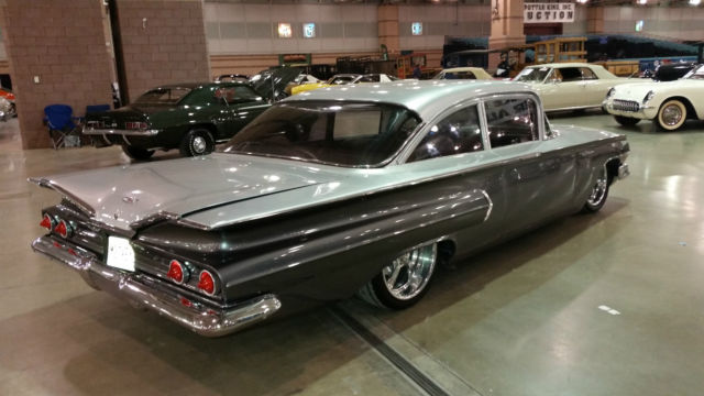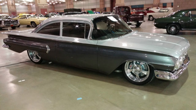 1960 cherolet biscayne impala a complete makeover. vintage air and heat stereo system. power steering. big 14 inch drilled mrp disc brakes with large calipers . air ride system . t1 crate motor with lots of chrome . 700r trans . custom painted dash with digital gauges shaved door handles with remote . the body is perfect and paint shines better then new chrome on car is perfect on car . people love crowed around the car at all shows it attends and turns heads when driving it. runs great and drive like new
