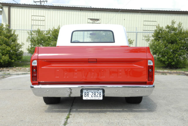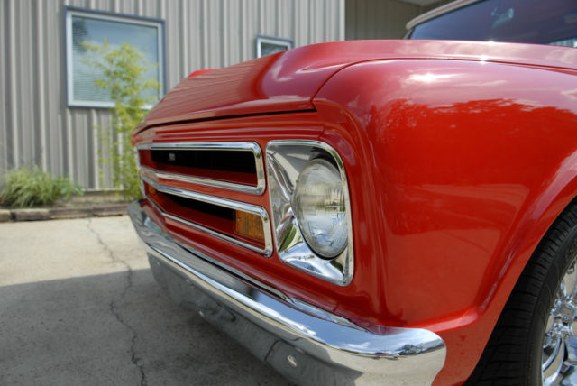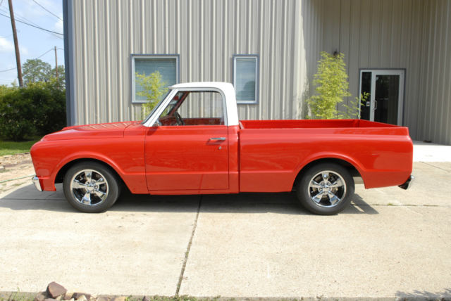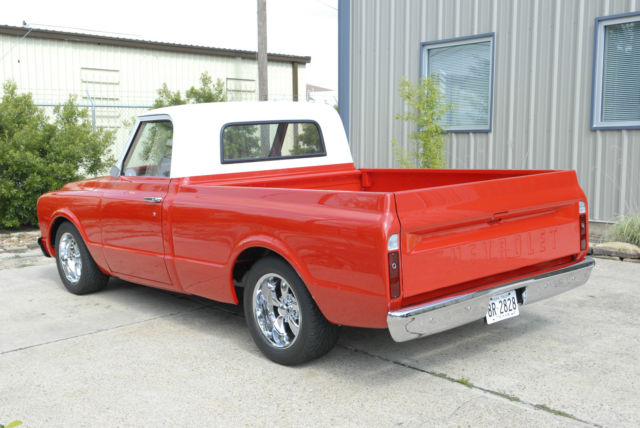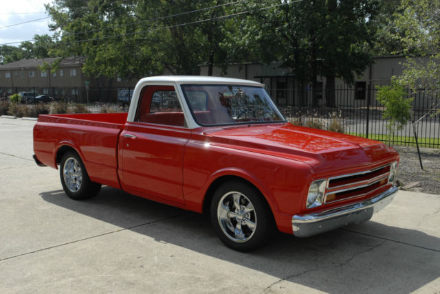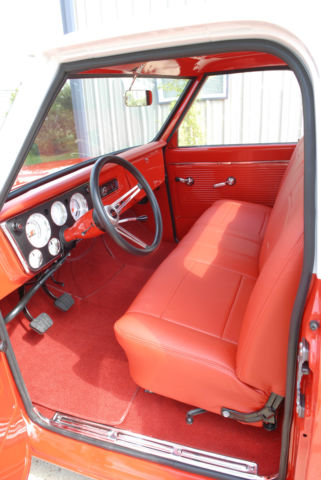 67 Chevy Short Wheelbase Fleetside Truck Colorado super clean truck bought from grandson of original owner. All original steel. motor. seat. steering. front & rear glass. owner's manual and some documentation Replaced rockers. kick panel. and cab corners Modified: 5. 5' drop in front. 2. 5" spindles. 3" springs 5" rear drop springs C notched rear frame 4 wheel drilled and slotted disc brakes one piece windows shaved emblems. firewall. stake bed fuel tank moved to rear frame rails Grill and headlight buckets chromed New: Bumpers Steering wheel Power steering All disc brakes E brakes cables Sony stereo and speakers One piece windows 2. 5" dropped spindles 3" & 5" dropped springs Nitro shocks Everything rubber: bumpers. gaskets. bushings. body mounts. etc. Rav Torch Red seat sculpted upholstery. visors. dash pad Torch Red/GM white paint Rotisserie restoration cab bottom. frame. and components epoxy black Inner fender wells Raptor epoxy lined. hood bottom 16 gallon aluminum tank moved between rear frame rails Marine fuel cap frenched into bed to appear stock. Polished windshield wiper arms ACC carpet and floor mats White gauges and Blue LED lights. match stereo Door locks Interior and exterior door handles and cranks Door thresholds Totally Stainless fastener kit. almost every bolt and screw is button head stainless RT5 Chrome rims Nitto tires Mileage set to zero. now has 500 miles Rebuilt: 250 6 cylinder with Mercruiser High HP cam 3 speed On the Tree with Borg Warner Overdrive. 33% reduction Steering column Kick panel vents Seat slide Super light truck drives like it is on rails. If a 250 is not your thing. drop a 7. 0 Z06 motor into it!