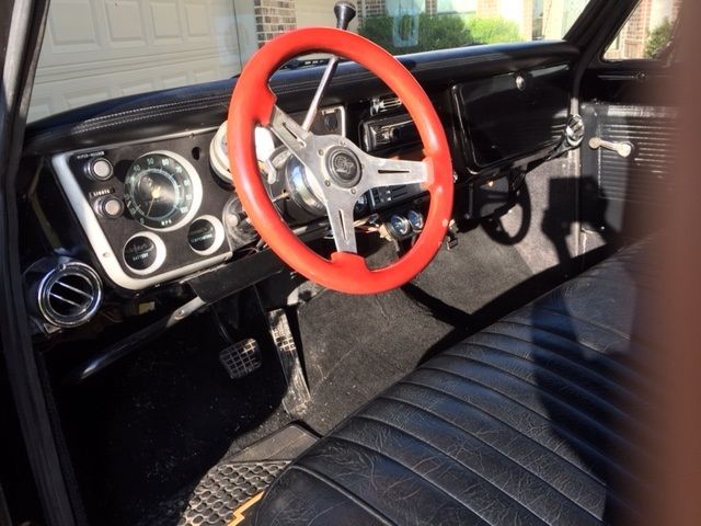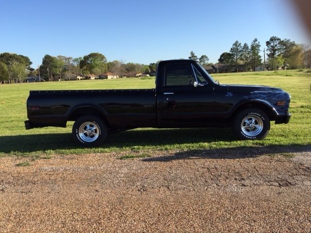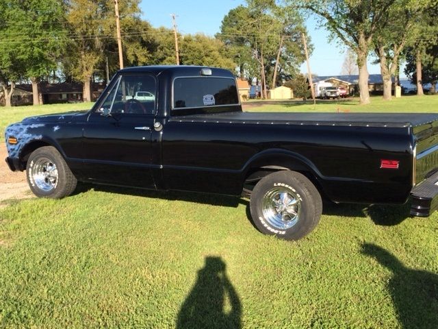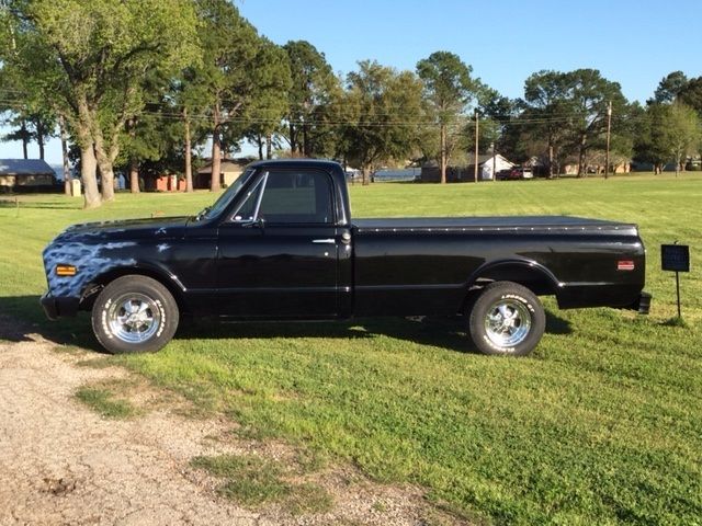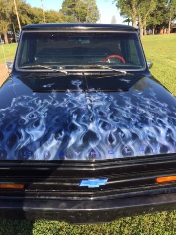 1968 Chevy C10 pickup. LWB. New 350-60 over. comp cam 260. double roller timing chain. delbrock intake. edelbrock 650 carb. headers w/flowmaster exhaust. ew radiator. complete vintage ac unit. p/s. /b. 00R4 trans w/deep pan. 12 bolt rear end rebuilt summer of 2014 w/new bearings. Eaton posi unit. 410 Richmond gears. xle bearings and brakes. 15x8 Cragar wheels w/275-60-15 tires. frame has been painted & pin striped. new paint summer of 2014. black with base coat clear coat with blue & purple flames and Skull detail on hood. Black interior. carpet & seats. New gas tank. am/fm/cd player. Body is extremely straight. Paint is excellent with no flaws. Nice daily driver or weekend cruiser. For more details please contact Tony at 903-432-4557.