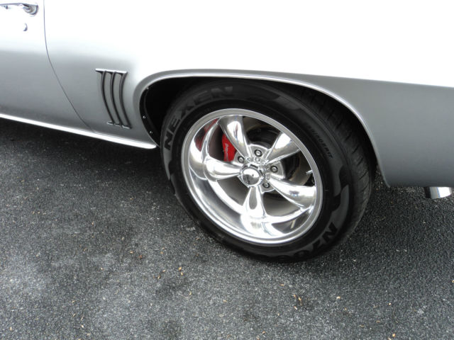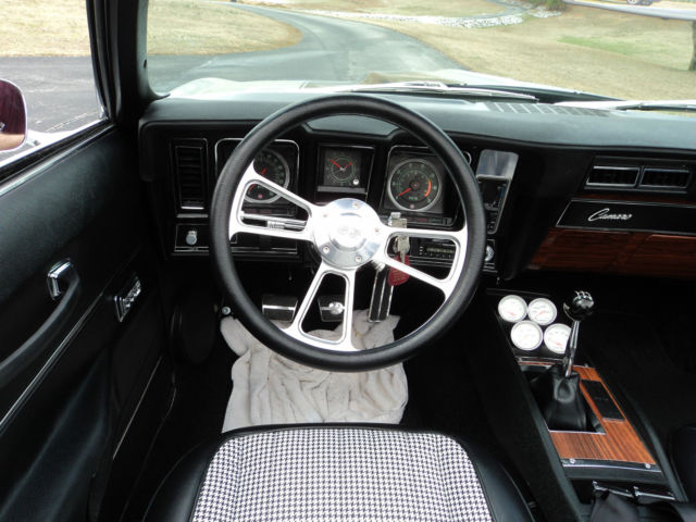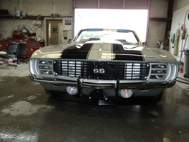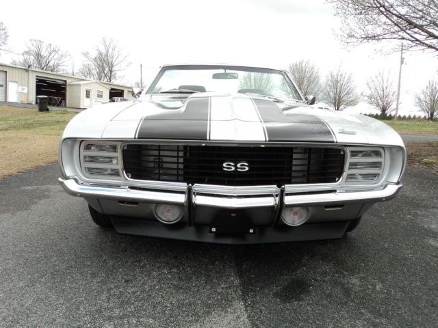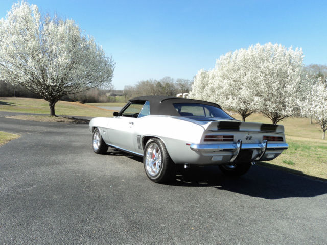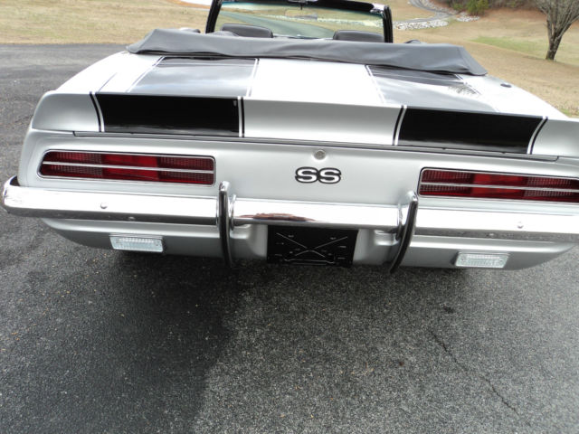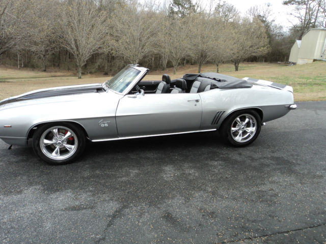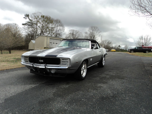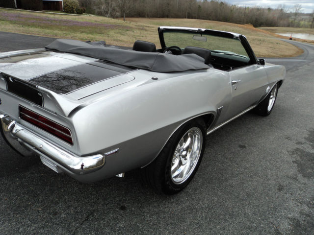 1969 Chevrolet Camaro Convertible RS-SS VIN#124679N584192 This is a brand new rotisserie restoration. All new sheet metal and floor pan replaced. There is no rust in this car. This car is as new as the day is was purchased from the dealership in 1969. The frame was sandblasted and primed with single stage urethane black. The under carriage and inside floor pans was sprayed with bed-liner material to protect from moisture. The front suspension was rebuilt with urethane bushings and tubular A arms. It has a new power steering box and this car handles like a new one. This car is primed with 2 part urethane primer. It’s painted with 3 coats of GM Switchblade Silver. It has painted black stripes. There is a total of 6 coats of Dupont clear-coat. Each coat was sanded and blocked before the next coat. The result is a high gloss mirror finish. The electric power top is new black cloth and fits tight without a wrinkle. Electric Detroit Speed headlights open when lights are turned on and close when lights are turned off. Windows have all new glass and are electric. This car has all new chrome. Upgraded wiring harness with all modern fuses. Interior is all new. New carpet. new seats with black and white hounds-tooth seat covers. new deluxe door panels. new instrument cluster with all new gauges. new console. new seat belts. new woodgrain dash with new dash pad. and new steering column and steering wheel. Car has new vintage heat and air. The engine is a newly rebuilt 454 with 400 HP. Flat top piston heads reworked. 280 comp cam. It has new aluminum intake and 750 Holley carburetor. The motor has a March front pulley system. new aluminum radiator. and dual electric fans. This car will run cool. Transmission is a T5 GM 5 speed rebuilt with Hurst shifter. This car has a new Mosor 12 bolt positive traction rear end with 373 gears. This car will cruise at 70 mph at 2300 RPM. Wheels are American Racing Torque Thrust. 8x17 on the front and 9x17 on the rear. Tires are 225x50ZR17 on the front and 255x50ZR17 on the rear. All new 12” 4 wheel disc brakes made by Wilwood. Exhaust is a set of Hooker Headers. coated aluminized 2 ½ “ pipe runs all the way back with flow master muffler and stainless steel tip. Seller will send more pictures if requested. Serious bidders only may contact Larry at 205-389-1960.