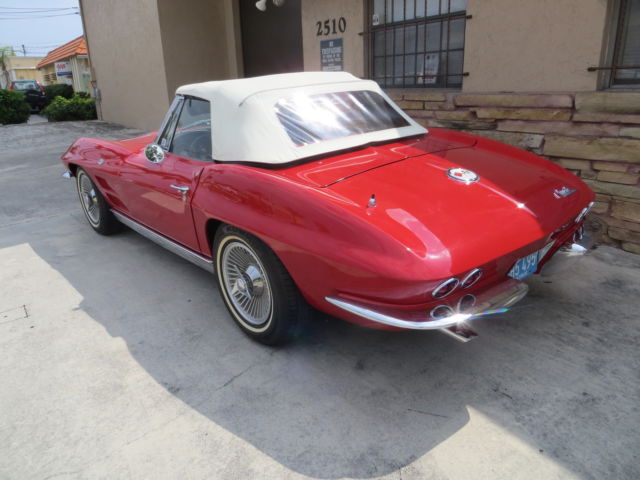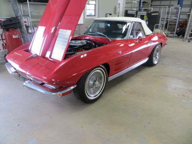 1963 Chevrolet Corvette Convertible327/300 HP 4 SPEEDVIN: 30867S102196Frame off Restoration underside is clear coatedCorrect matching numbersNew Carpet327 CI Engine4 speedNew red paint with black interior (car was originally white)New white wall radialsChrome bumpers redoneNew rebuilt brake systemNew Rebuilt clutch assembly and transmissionheadlights workingEngine was pulled and detailedKnock off wheelsFlowmaster ExhaustPlease see our about me page. we are constantly buying and selling Cadillacs. This is a car that I have seen in person and am helping to help a customer scale down a collection. You will be paying him and the car is in Boca Raton Florida . Please see our other auctions. I am not a Corvette expert. please inspect the car Monday through Friday during business hours if you would like to take look. The buyer is responsible for all transport and shipping charges. 301-672-1000