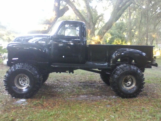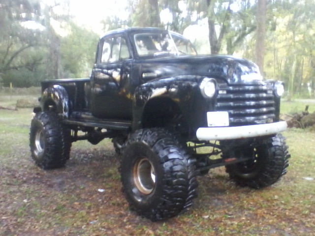 1952 Chevrolet with a big block 454 Last registered and driven on the road in 2010 sits on 44* inch superswampers and is approx 8ft tall owner befrore me used it as a daily driver to go back in forth to work i bought it when i didnt even have a drivers license thought it was cool also bought a 1968 gto to run down the track in defiance i guess . shes been sitting in my daughters back yard for a couple of years i start it once a month gas tank is located in the back of the truck and some water got in the tank ive drained the tank put put on o holley 650 she runs fine now bands in the tranny were a little dry i put some lucas non slip in and now she catches enough to spin the tires bed was soft so i took it out. frame i believe is a k5 blazer maybe a k7 and all undercoated cab is all original inside theres a little rust under the rear window of the cab and on the inside bottom of the door i have the new trim for the door areas and there not all that bad. Theres alot of truck here and a real head turner ive tried to give an honest description of the truck she will start up and drive down the road right now but it will need a little care lights all work but you really have to stand on the brakes to get her to stop. open to all offers sold my boat to put a kitchen in for the wife might take a boat and some cash.