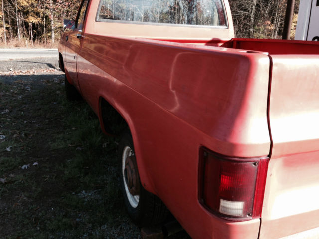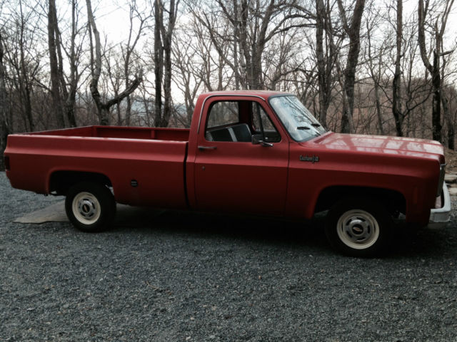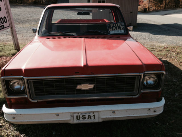 1974 Chevrolet C 10 half ton One owner prior to me. in Denton NC for 40 years 6 cyl. 3 on the tree Options are listed on factory options sticker still on fender (see pic) The body is super clean Original paint except top of tailgate looks like it was blown in The bottoms of the doors are exceptionally clean A couple spots on the nose of the hood One hole on bottom of passenger fender where battery leaked at one time. see pic The truck was kept in garage. window rubber is great and dash does not have any cracks Recent work done: power steering. power brakes added. new radiator. new belts. new hoses. new distrubutor. wires. plugs. new muffler. new battery. new DunLop tires. parking brake cable replaced. removed heavy farmer bumper. painted wheels. chrome hubcaps (original painted steel hubcaps incl). about $2500 in total repairs in last 12 mos Has manual choke cable added 1974 C 10 brochure and owner's manual included (reprints) VERY hard to find such an unmolested truck Currently licensed and insured. drives great