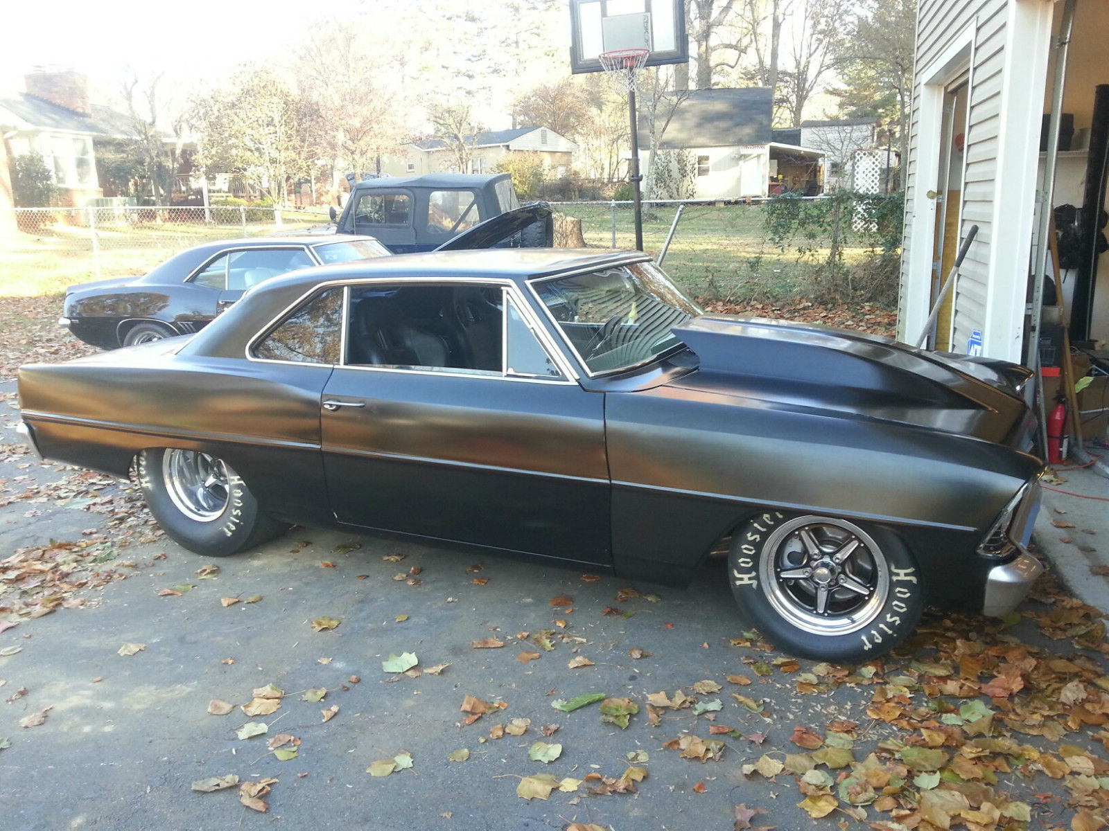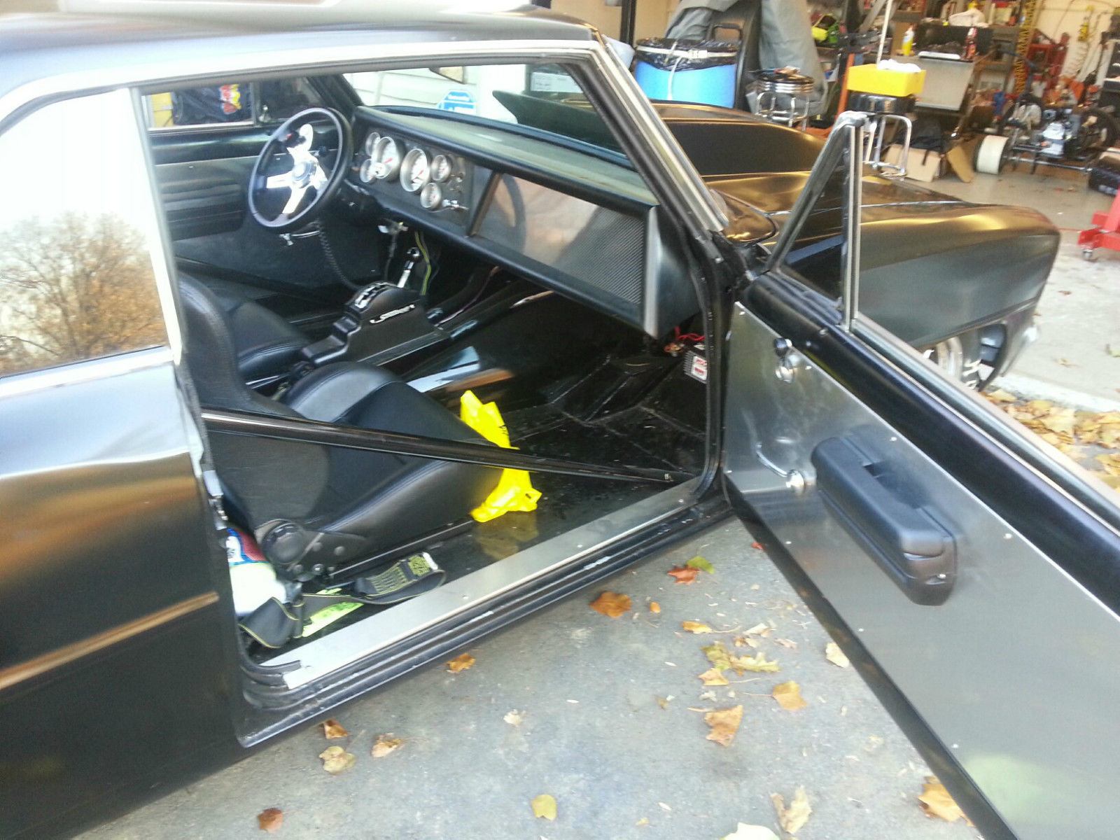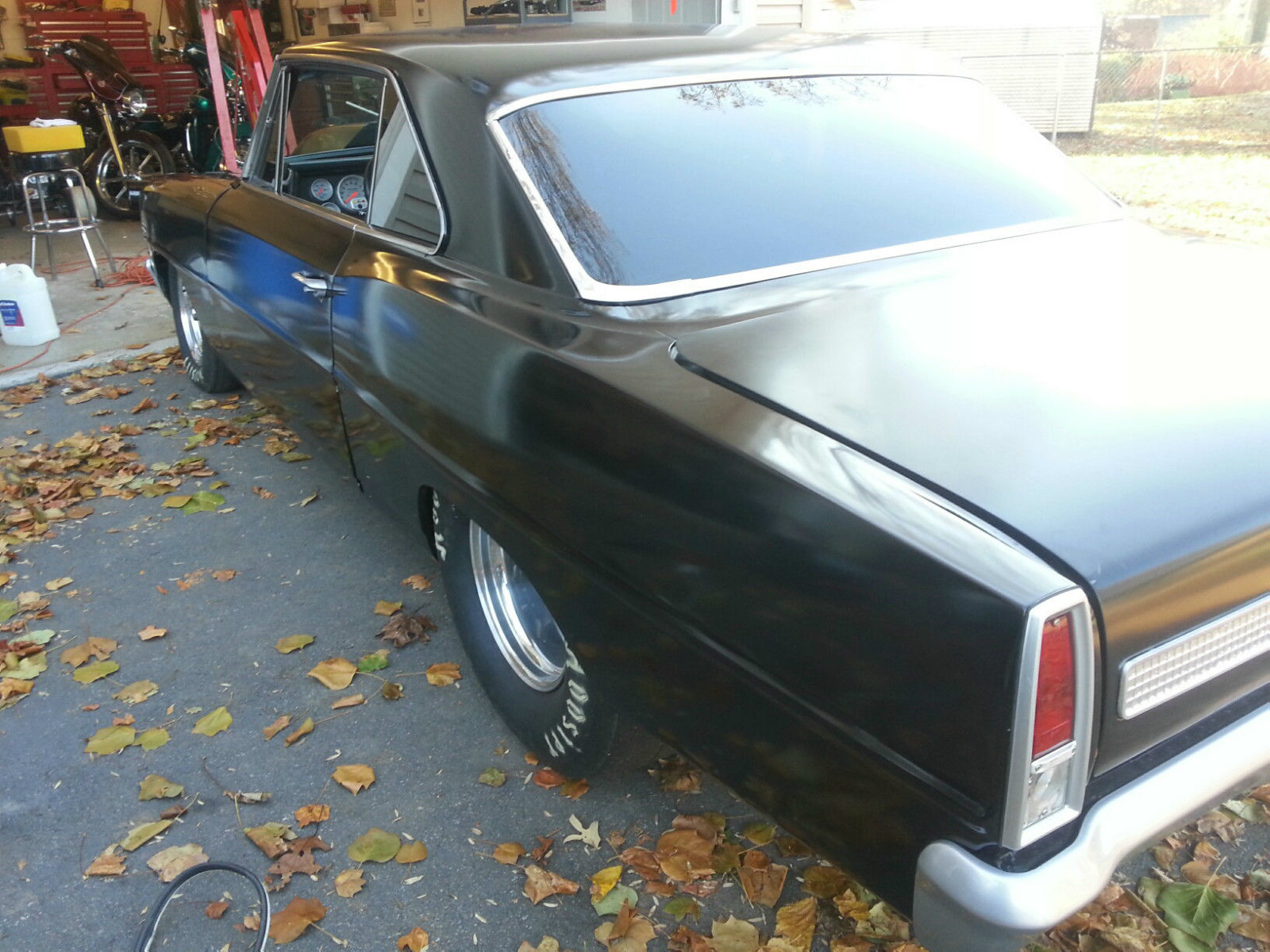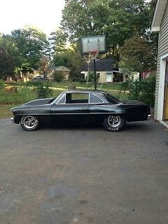 1967 nova pro street. all metal except the hood. the car is painted satin black except for the two front fenders they need to be shot . not that noticeable . bsolute no rust or rot. custom one piece dash that isn't tacky the chassis is box and was done by a local fab(nascar) shop along with the sheet metal work the body and frame were then coated with paint and sound deadener. it has a brand new mustang 2 front end. 68 bbc steel crank forged pistons 10. 5to1 comp. solid roller. roller rockers. alum heads. stud girdle. and built headers ceramic coated. nbsp;quick fuel 950 carb the car is plumbed for nos and has never been sprayed. trans Manuel valve body 700r4 built to the gills 4000 stall converter with anti balloon plates. tci input shaft. 5 gear planetarys. heavy clutches. etc . custom drive shaft. 9 inch ford rear locker 4. 56 gears. wheel disc brakes. inch exhaust to the back. billet specialties wheels. not a throw together build . every thing in/on the car is new and it is a street car it has not been run at the strip yet so I don't have any times. The whole car is new. like I said fun street car . lots of attention pounds the ground and has overdrive.