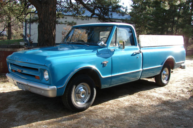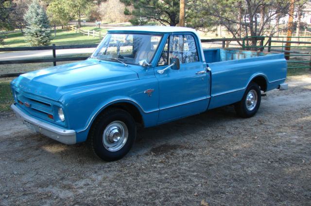 Selling my 67 pickup to fund a possible house purchase. C10 Longbox. 6cyl. 4spd on floor. All original powertrain with 42000 miles. It was purchased new in Denver and used on a small farm to haul produce around. low original miles. I bought from original owners estate and have documentation. Was used and has had 2 cheap paint jobs in blue. 1 small dent was repaired on right front fender. Rust free and original body panels. no rot in floors rockers etc. Looks great! Paint has scratches and isn't perfect at all but is usable and cool as is. Original seat is worn on bottom but springs still sit well. Runs great and cruises smooth. Manual steering are tight brakes are tight. All electrical works as should and all glass and trim are nice. I drive it around quite often. not the fastest truck but fun to drive. Runs great. I have original hub caps but I like the dog dish cap look. Brand new tires. Mesa AP from Big O. Bid to win. priced well for what it is. Shipping available. Call text or email questions 720-201-9000