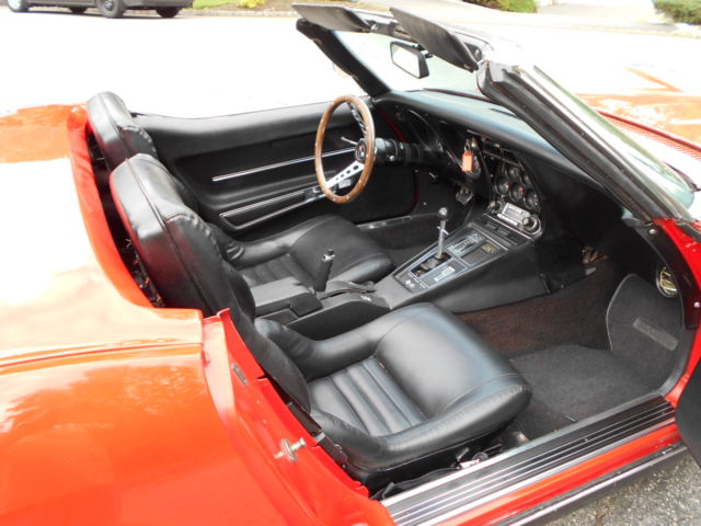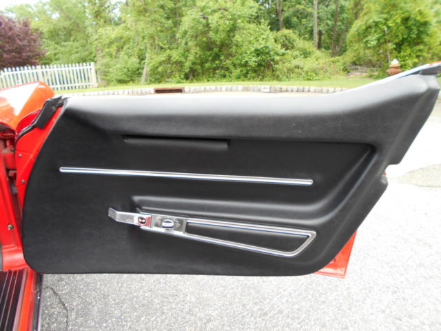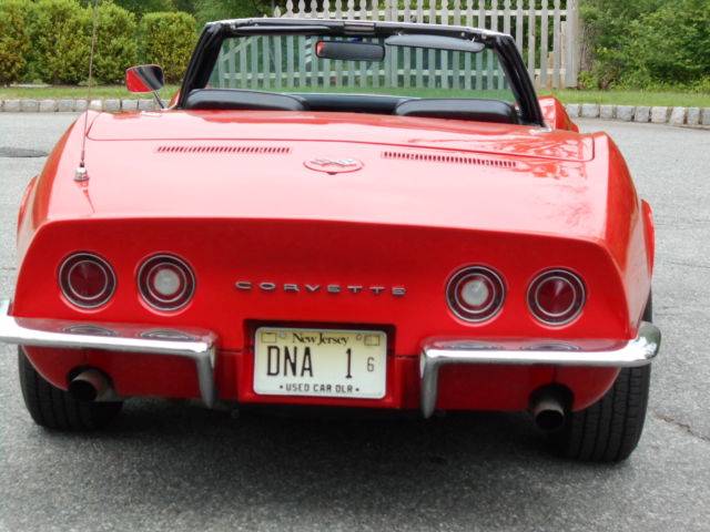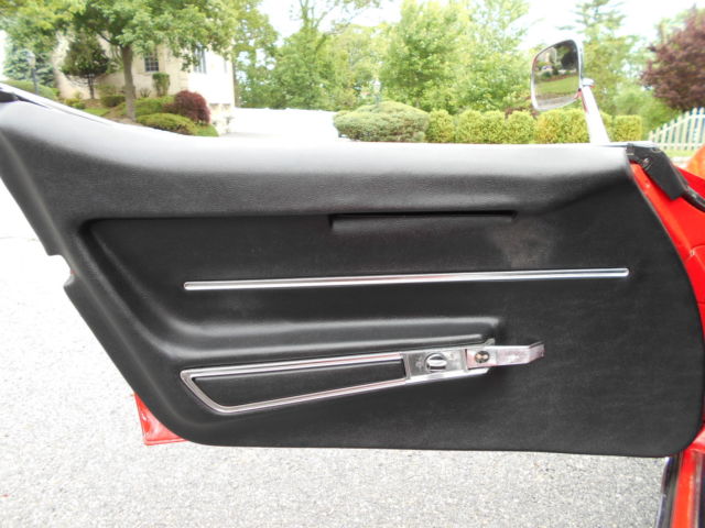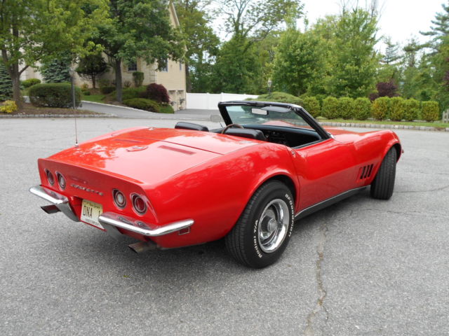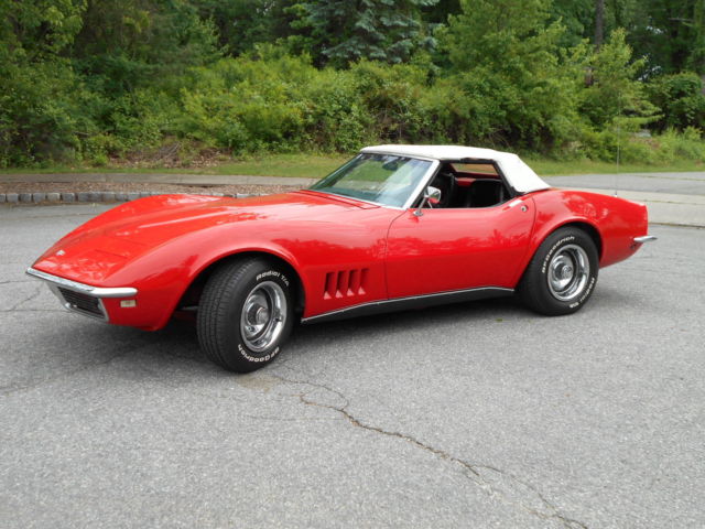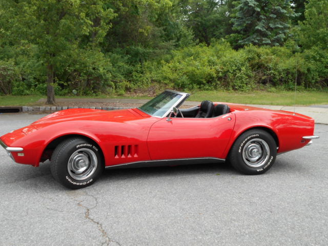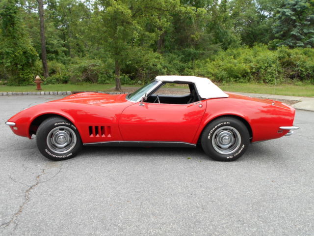 1968 Corvette Convertible350 4 speedfact a/cp/s p/w The older professionally applied Rally Red paint has just been treated to wet sand compound and wax. Shines like a diamond. No chipsscratches or cracking.White top is in average condition without any rips.Black leather seats and interior in very good condition.A/C non operativeneeds new line. The nom 350 with its edelbrock manifold and holley carb runs excellent while the aftermarket mufflers give it that rumble sound we all love so much.No issues withe the clutchtransmissionrear end. Shifts smooth as butter with its factory shifter.Power windows work great Headlights pop up as designed.Clock does not work.Like new bf Goodrich radials on factory rally wheels are in excellent condition. No rust. Runs and looks excellent.DEPOSIT FULLY REFUNDABLE!!! if not satisfied at inspection. For more info phone Al at 973-223-5675 Thank You For Viewing My Ad!!!