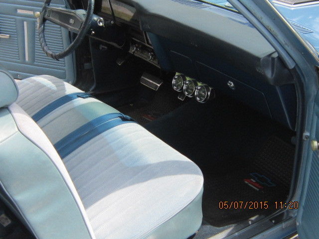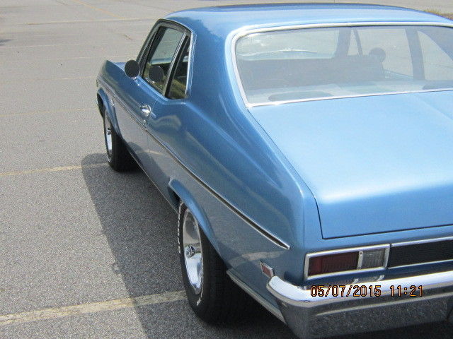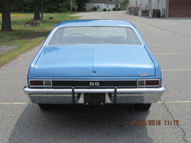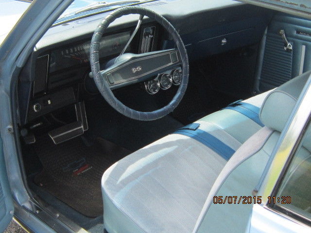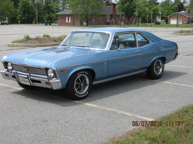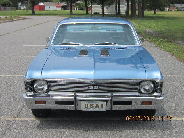 1969 nova code 53 glacier blue exterior with blue interior all original exterior body panels with no rust at all paint is right at 15-16 years old and still very nice has a original original gm ss hood this is a non ss car made in to a ss has the the mag. 500 wheels that are mint with brand new bf Goodrich tires with spare original jacktrunk flooris perfectall gass is mint and originalall stainless is very mint and original bumpers with bumper guardsmotor is a 350 with the turbo350 transmission every thing works on this nova back up lights glove box etc . its very hard to find these cars that have beenallchop up this nova drives very tight power steeringpower drums 307 rear end transmission shifts perfect this nova does not leak no wherewith the build in tac in dash is very rare where the clock would be.this nova is for sale no trades. again this nova is very nice iam the third owner and been in virginia all its life.any questions please call 757 377 4839 19750.00 nice nova for this money.
